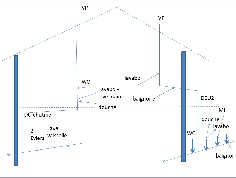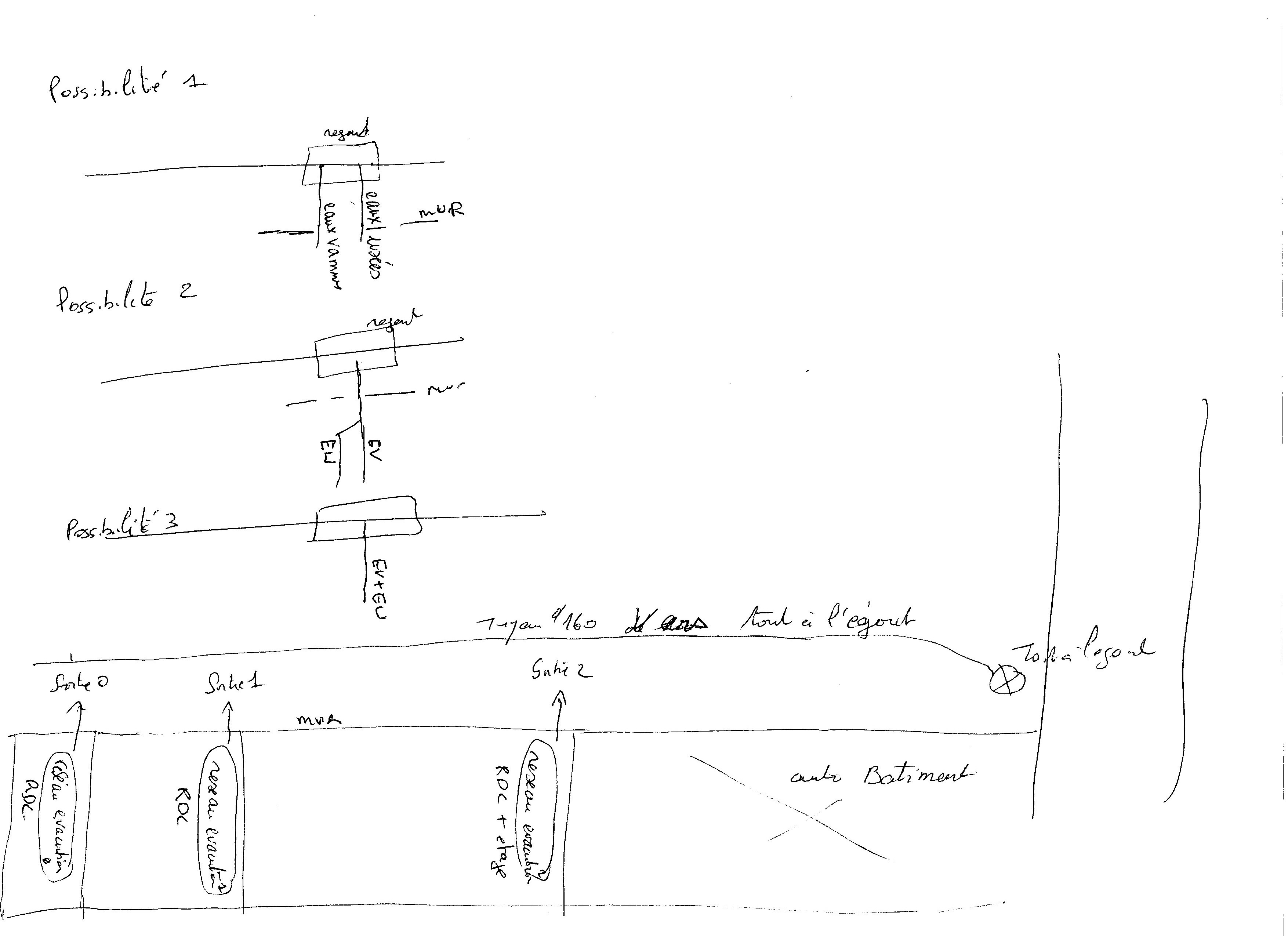 Il y aura 3 sorties d'évacuation qui d’après l'entrepreneur vont se raccorder directement au tuyau de 160 qui part au tout a l'égout et sont représentées au schéma ci dessous :