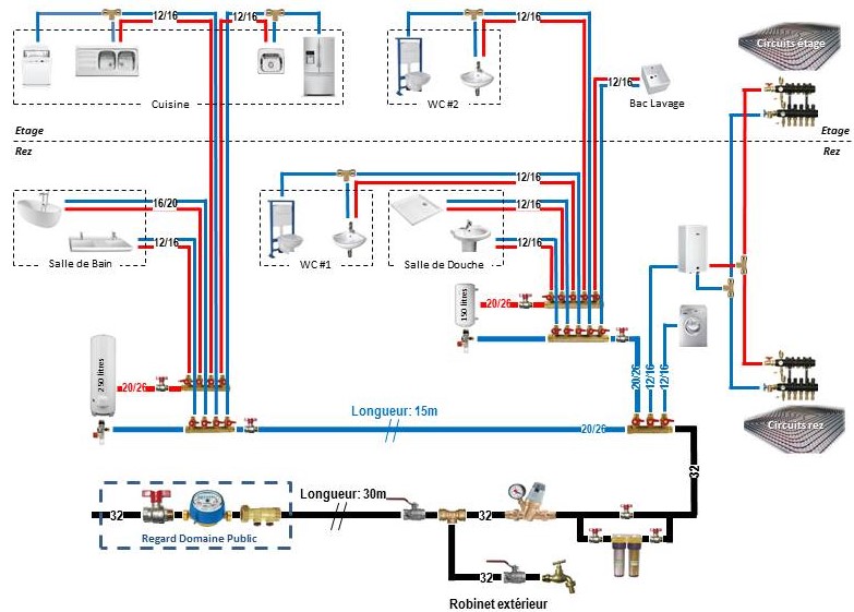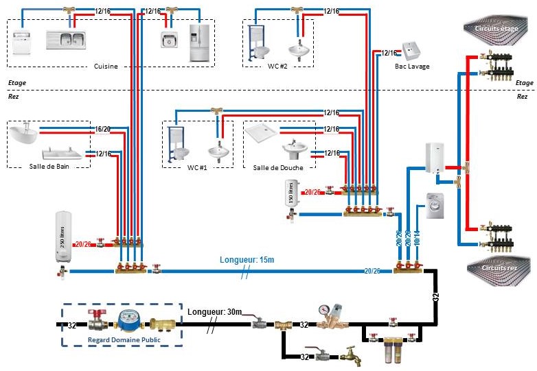 Tout d'abord bravo pour le site et son esprit d'entraide. Novice en plomberie et très largement auto constructeur, j'aurais besoin de l'avis des pros du site sur mon schéma multicouches ci-dessous. Vu la longueur de la maison, le schéma prévoit 2 ECS (une principale et une d'appoint) au plus près des zones de consommation. Je souhaite éviter une boucle de circulation grand format.