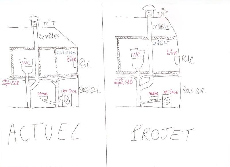 les eaux usées de cuisine et salle de bain vont dans une "fosse de décantation " avant de rejoindre la chute principale qui va à l'égout.