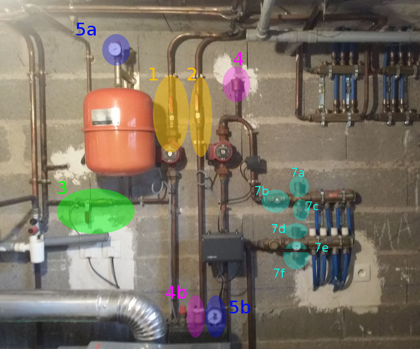 2- fermer ce qui me semble être les vannes d'arrivée et de retour du circuit "radiateurs" (cf. points 1 et 2 de la photo attachée).