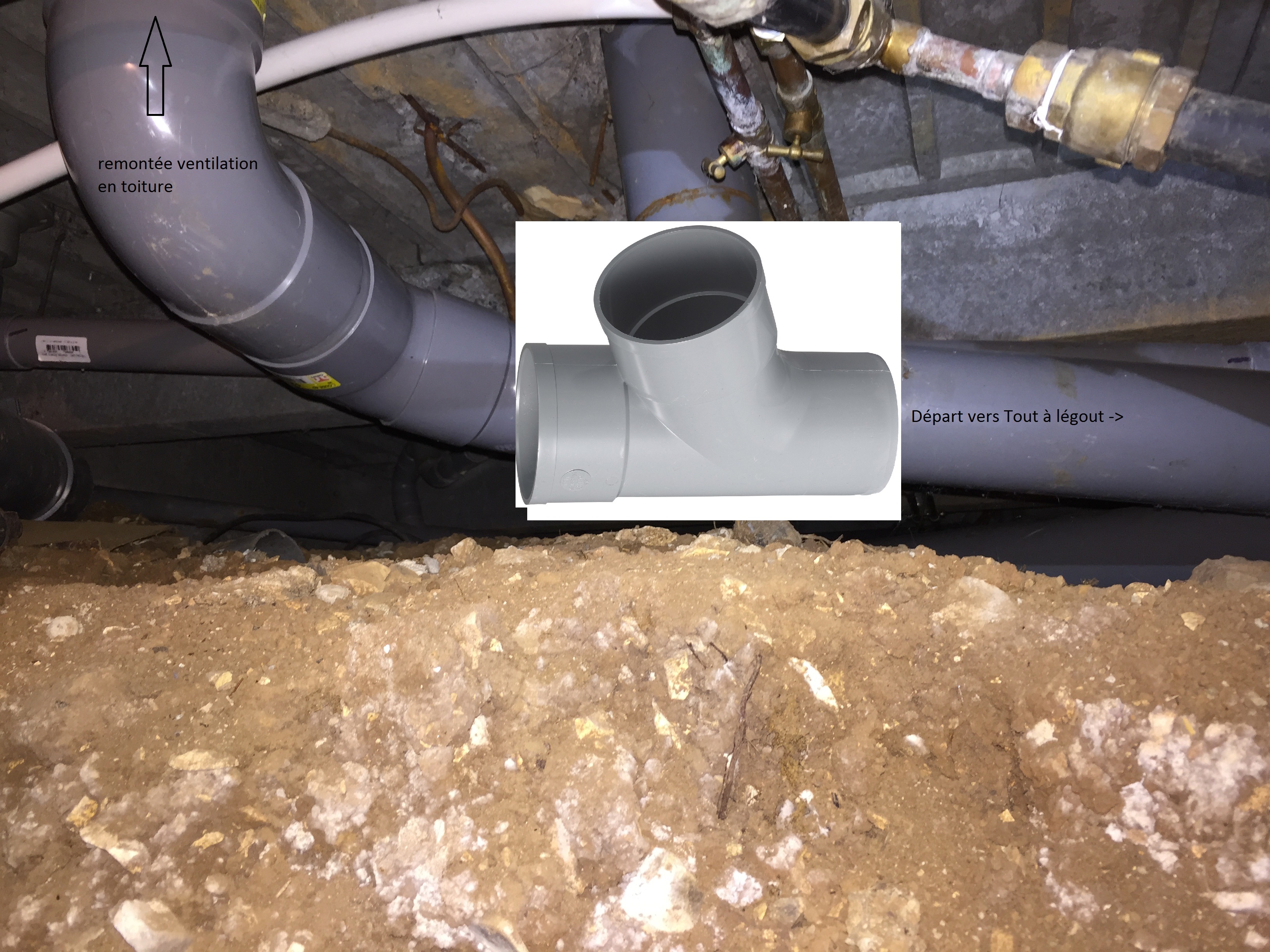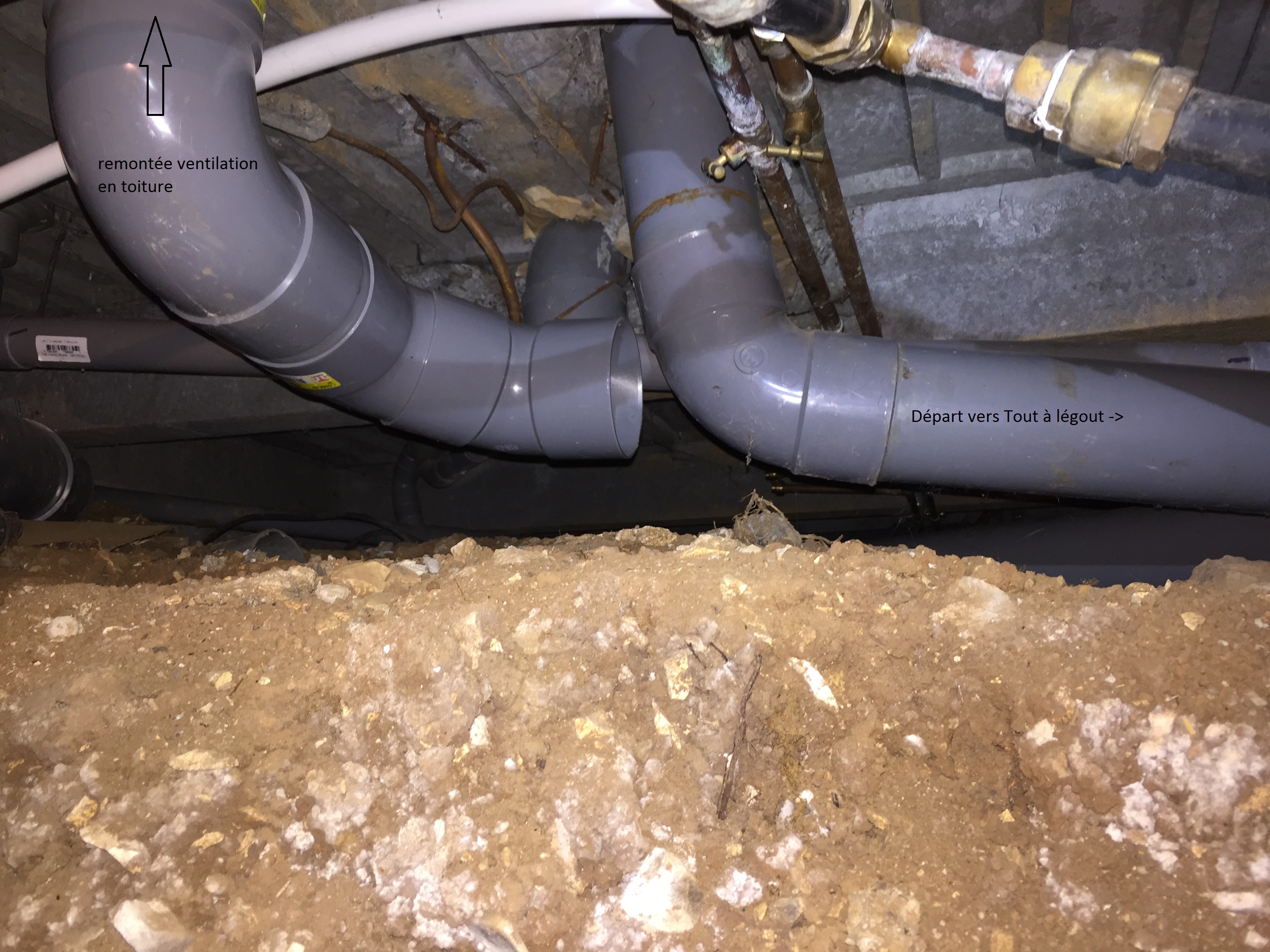 Voici mon problème aujourd'hui, je ne vois pas comment reprendre ce conduit de ventilation sur le tuyau d'évacuation principale en 100mm. Si joint la photo de l'installation. Les coudes sur la remontée de toit ne sont pas existants, c'était pour essayer une solution.
