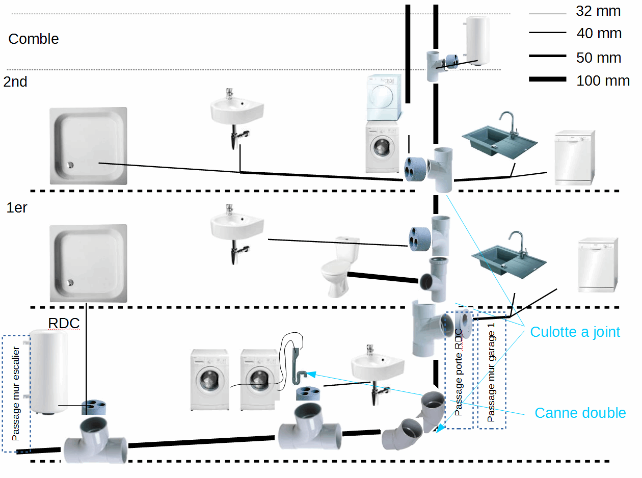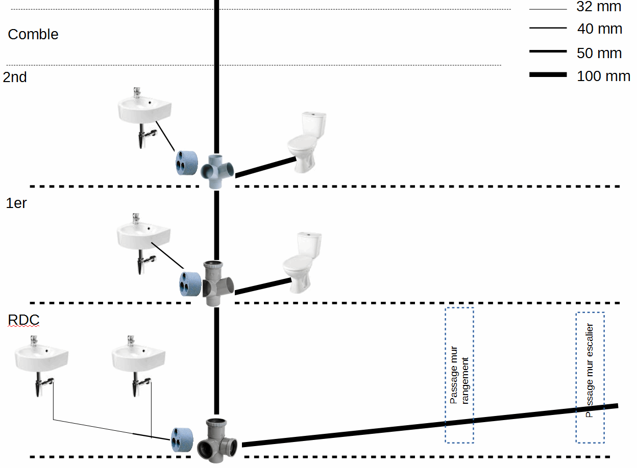 Tout d'abord je vous félicite et remercie pour les nombreux conseils que l'on peut trouver ici, cela m'a été d'une grande utilitée pour la réalisation de mes schémas. Cela m'a permis de réaliser mon schéma d'évacuation principale ci-dessous et je vous le soumets pour avis. Ce plan est pour une maison ayant une habitation au 1er et une autre au 2nd. Je n'ai représenté que les raccords de 100.