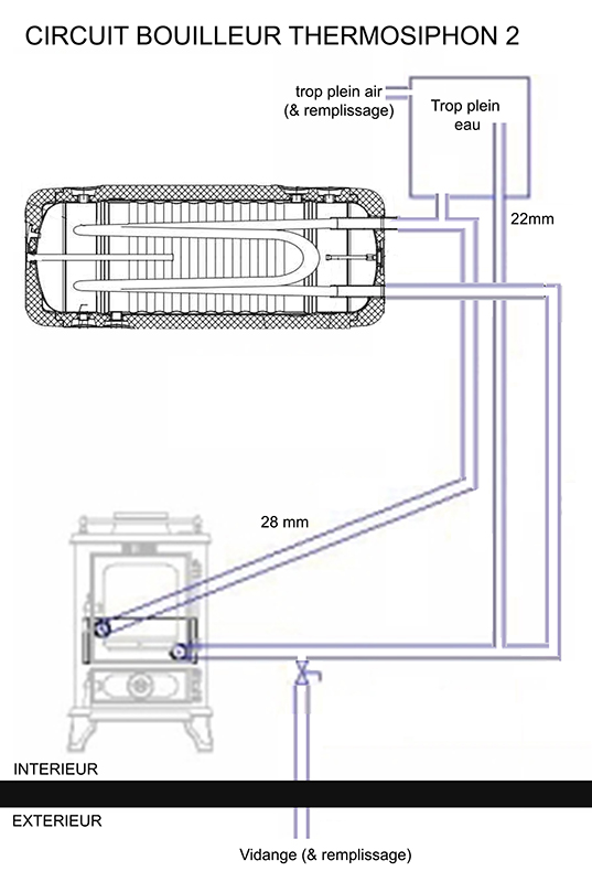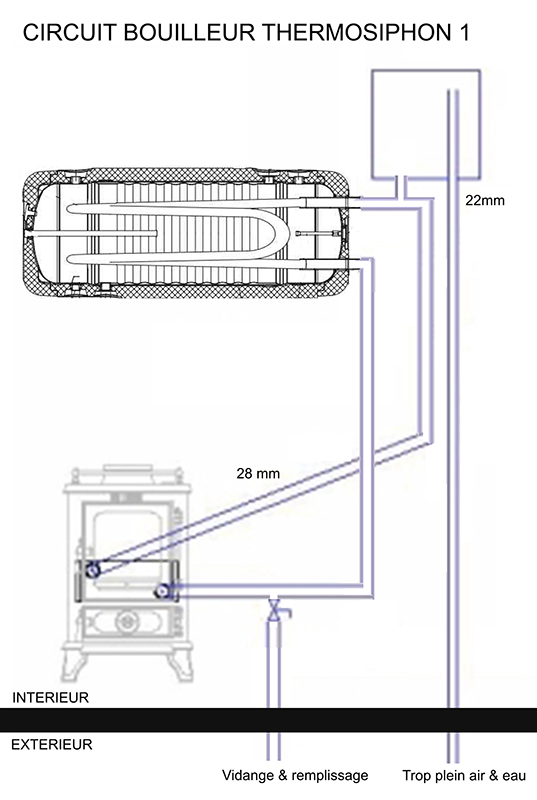Pour mon installation ECS j'aimerais opter pour l’utilisation d'un ballon double échangeur horizontal de 140L en privilégiant la chauffe eau par capteur solaire et en complément utiliser le mini-bouilleur de seulement 0.75kw, d'un tout petit poêle à bois de 4kw. Le capteur et le chauffe-eau seraient situés sous le ballon afin de réaliser les deux circuits en utilisant le principe du termosiphon.
