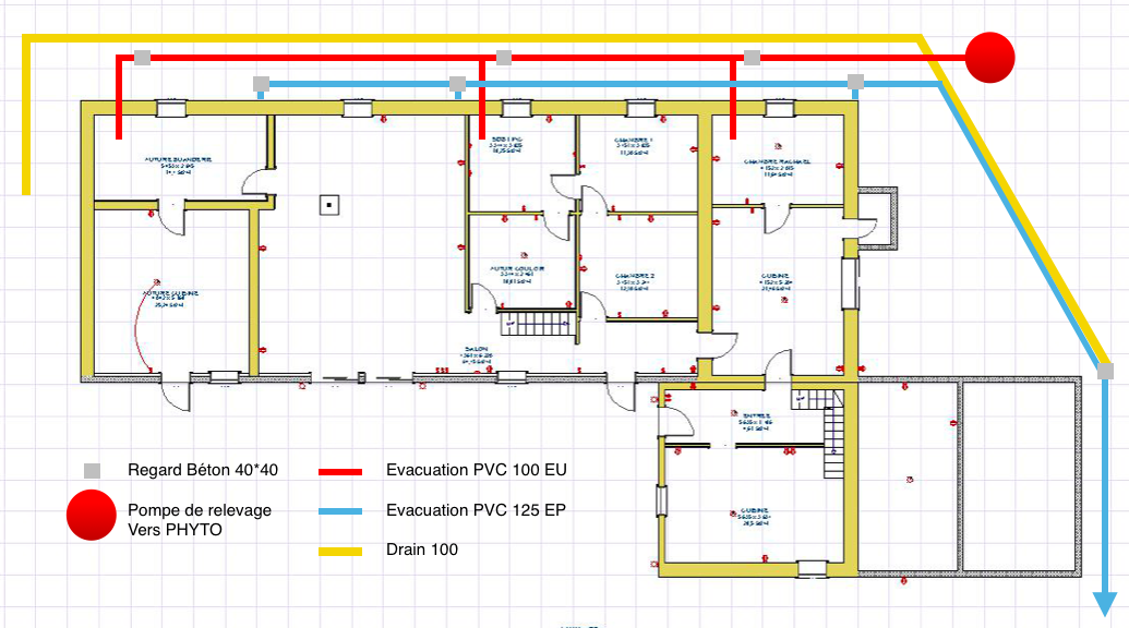 - L'evacuation EU va dans une pompe de relevage (en attente) pour terminer en phytoepuration