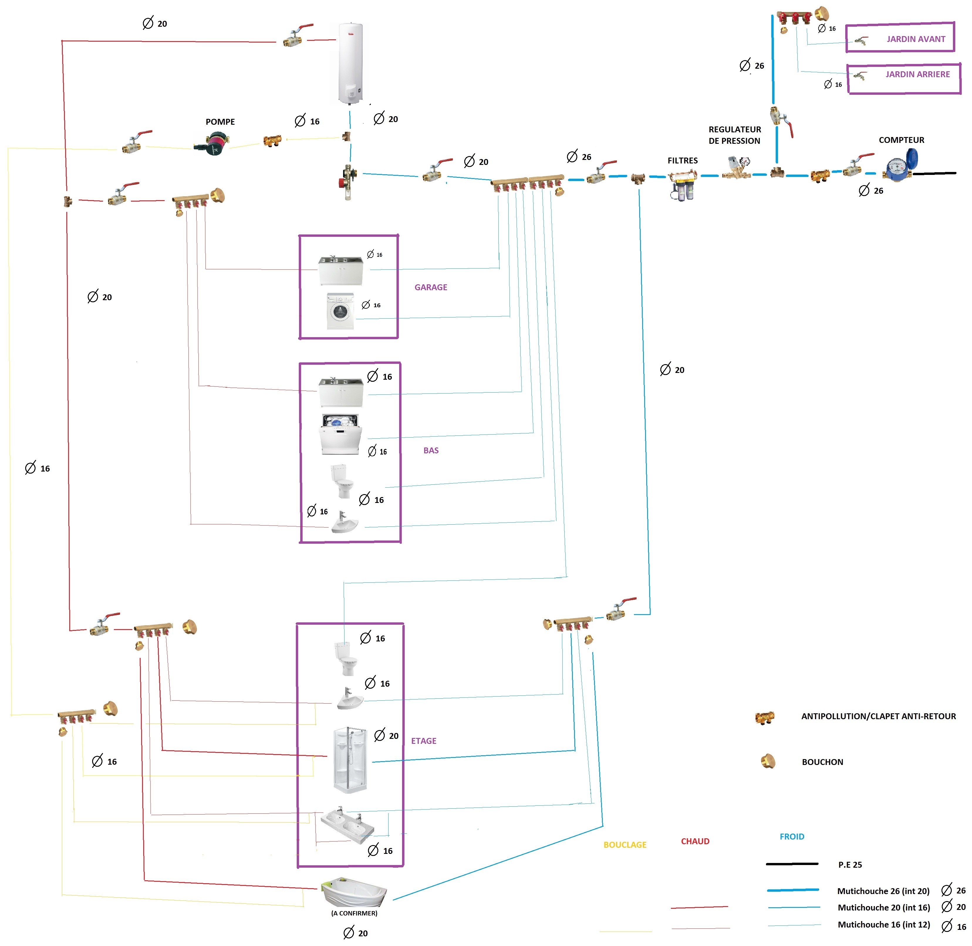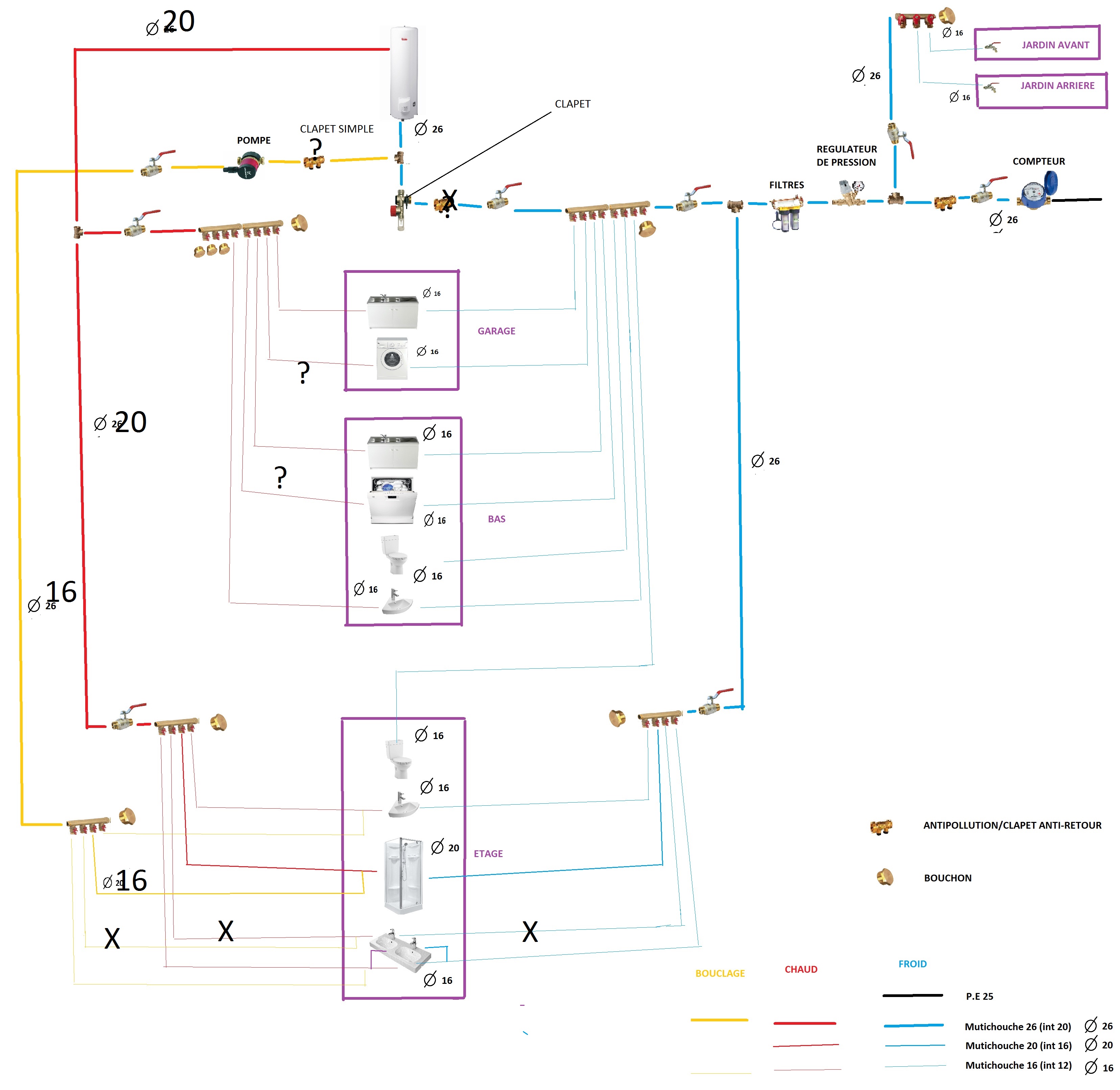 La salle de bain étant à l'étage, je souhaite faire un bouclage ECS, à ce sujet j'ai des question sur les placements des clapets anti-retour. Faut il pas en mettre un juste en dessous de chaque robinet sur le départ de boucle ?