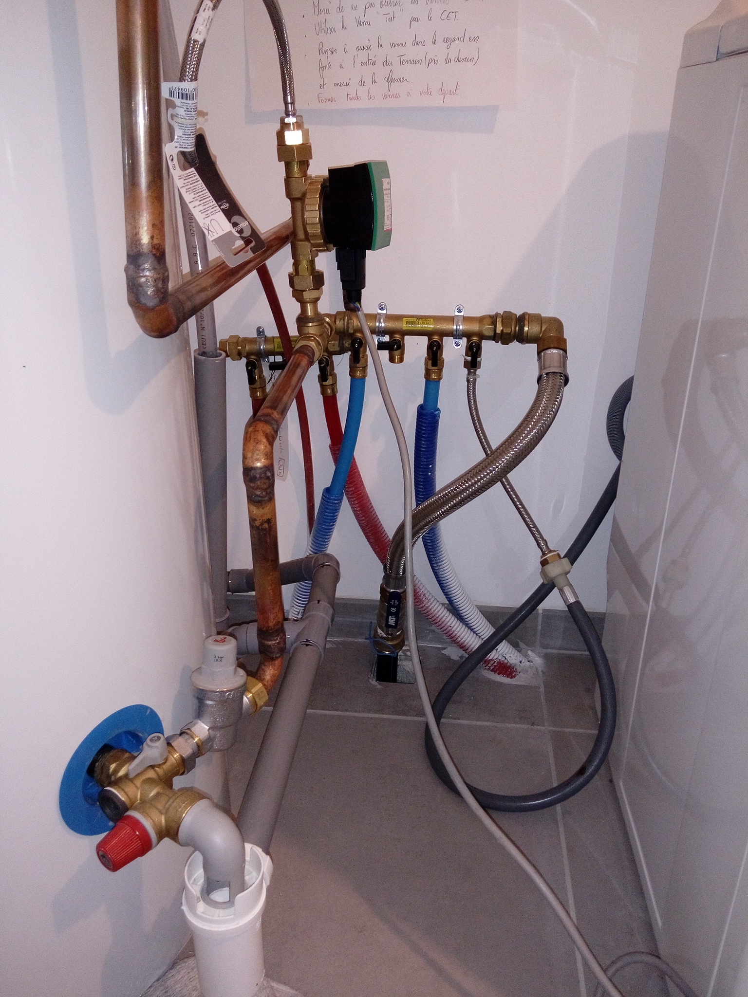 L'eau du retour de la boucle arrive par le tuyau en PER rouge puis est relié au circulateur pour être ensuite injecté sur l'arrivée d'eau froide. Je vous montre les anomalies après vous corrigez si vous le désirez.