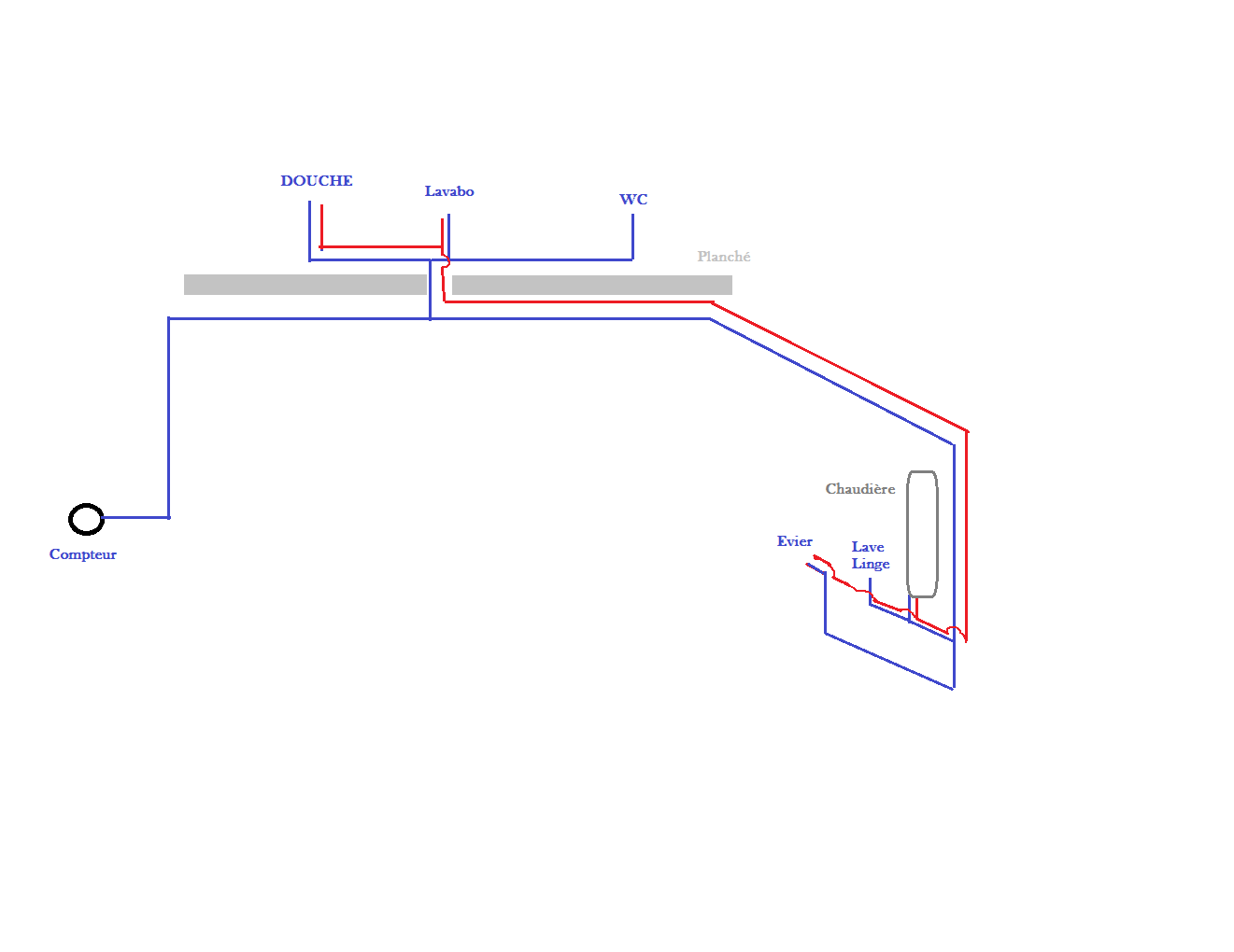 Je dois refaire toute l'installation d'une petite maison de 45 m2. Pour résumer, j'ai l'arrivé d'eau avec le compteur au niveau de ma porte d'entrée (photo du compteur). Je remonte ensuite vers le plafond pour aller au fond d'un couloir de 6 m et aller vers la cuisine ou se trouve la chaudière (Frisquet). Vous trouverez un schéma simpliste de ce que je désire réaliser. J'ai également pris en photo le compteur que vous trouverez ci-joint.