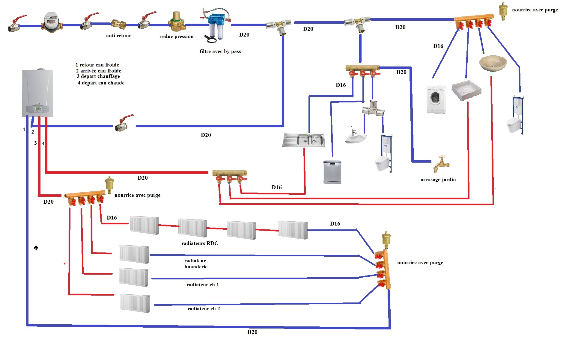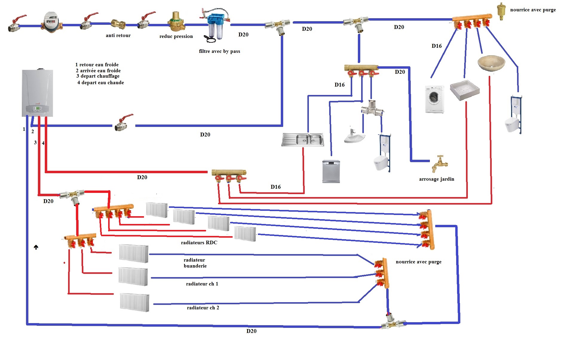 Je m'appelle Fabien et je rénove actuellement ma maison. Je refais intégralement la plomberie. J'ai planché sur un plan et j'aimerais avoir vos avis car je ne suis pas professionnel. Comme j'ai un budget limité, j'essaye de limiter les dépenses...pour cela j'ai eu l'idée de mettre le réseau de mon rdc en série car il est fort éloigné de la chaudière et de plus le bâtiment est super isolé. Merci de me dire si mon plan est correct. installation multicouches, chaudière à condensation ( 24kw). MERCI de votre aide!!