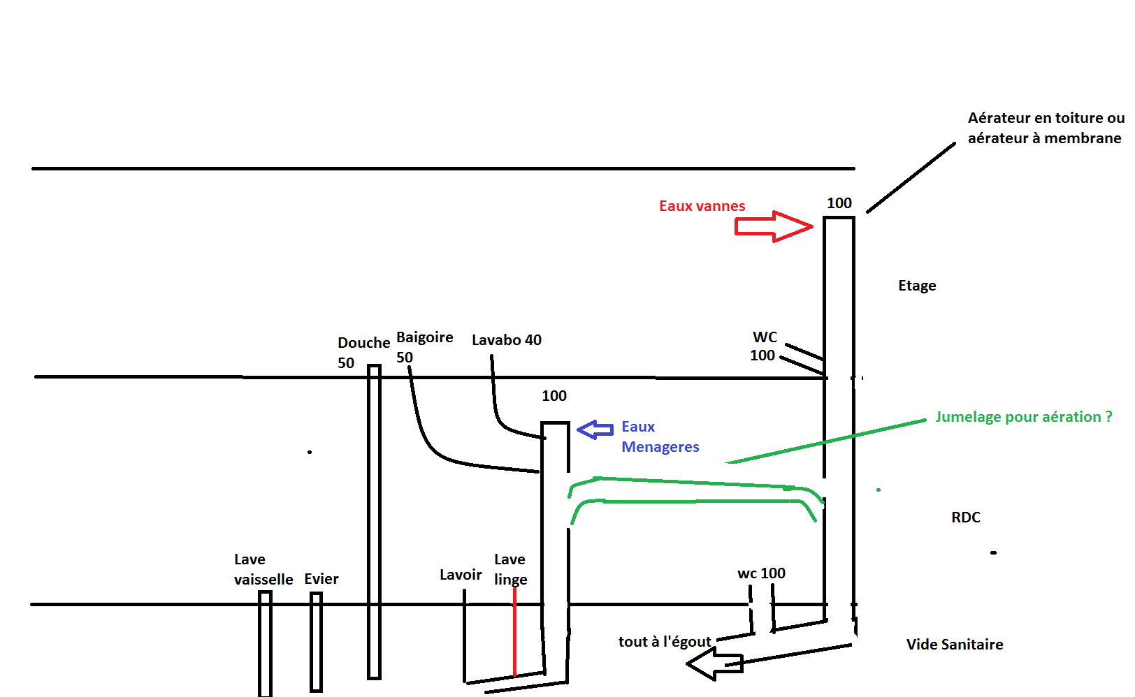 En pleine autoconstruction de maison (et déconstruction de soi même ^^) j’aimerai faire valider par des spécialistes, mon schéma d’évacuation et mes prévisions d’alimentation générale en PER.
