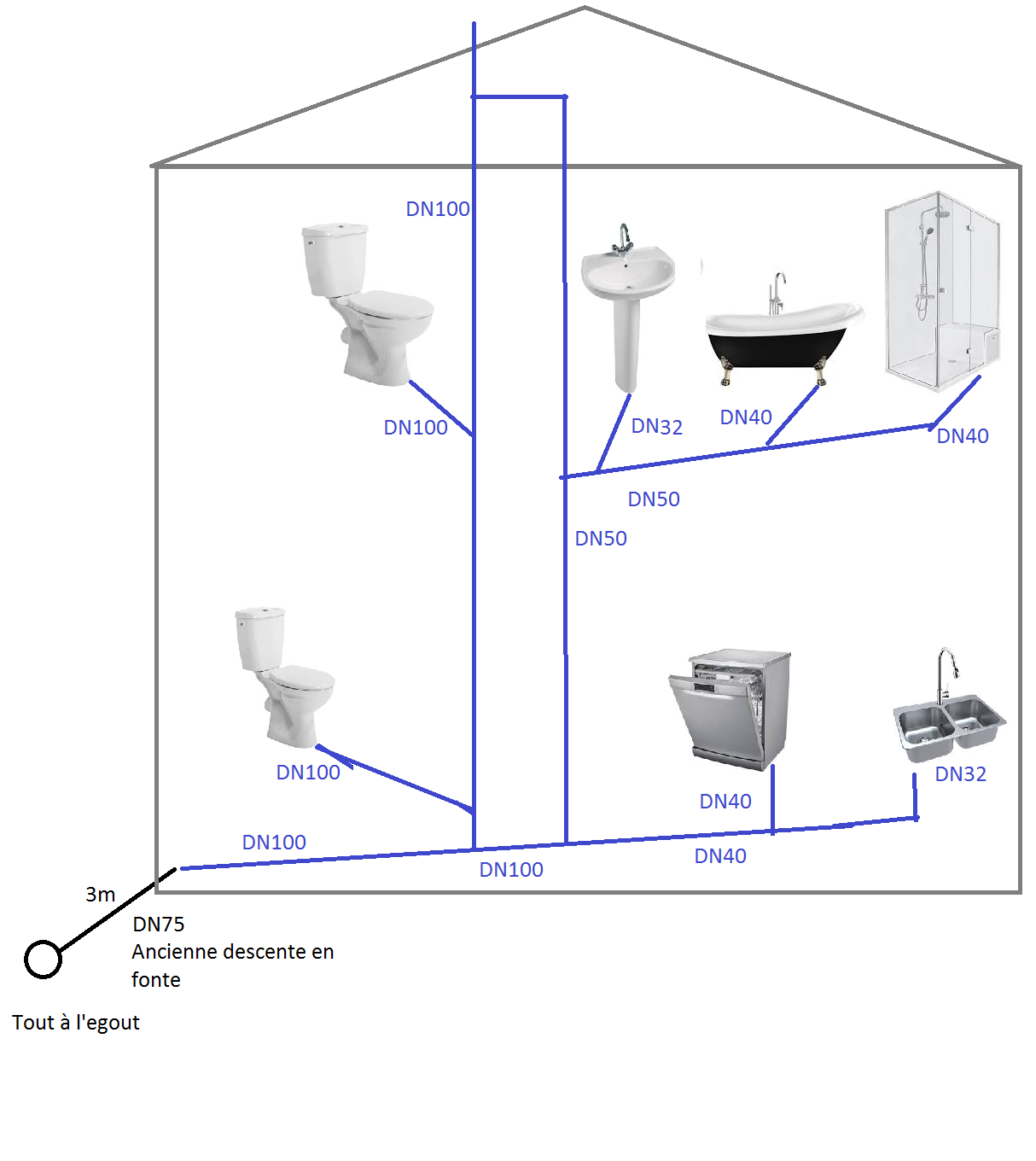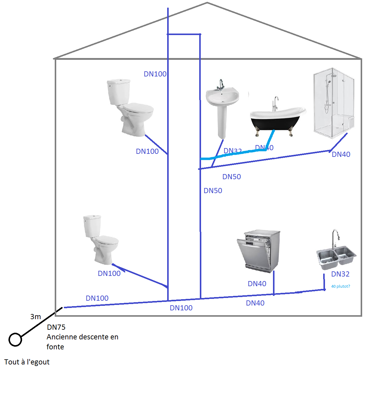 je vous écris pour vous demander votre avis sur ce schéma des évacuations que je souhaite installer dans la maison que je rénove actuellement.