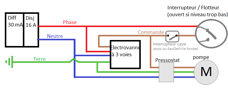J'appuie sur mon interrupteur qui force le mode "eau de ville" (ça coupe l'alimentation de la pompe, et en même temps, tourne la vanne 3 voies vers le réseau eau de ville). Pour info, lorsqu’il n'y a plus d'eau dans la cuve, l'interrupteur flotteur, donne la même commande (les 2 sont en série).