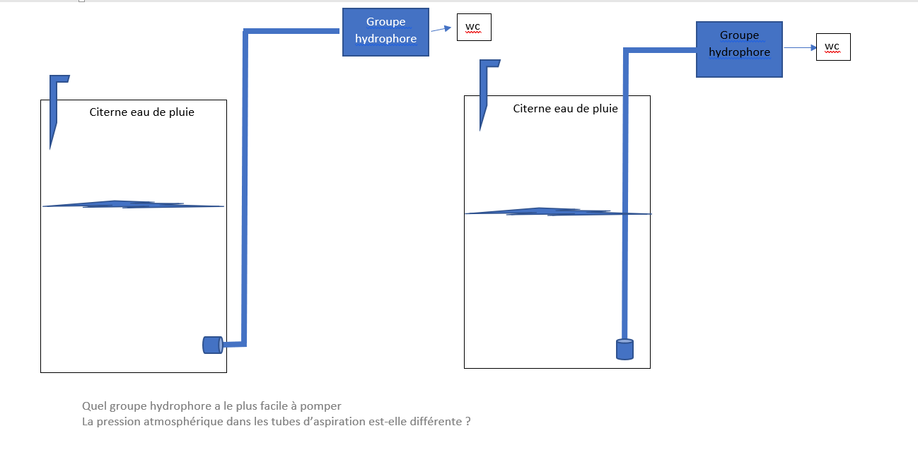 bonjour je me pose une question sur la meilleur façon de faciliter le pompage d'un groupe hydrophore à la citerne à eau de pluie en prenant l'eau a la base extérieure la pompe bénéficie t elle de facilité savez vous si oui expliquer si il y a une différence de pression atmosphérique suivant prise d(eau en plongent le tube à l'intérieur ou prise à la base extérieure voici un semât et mon email merci de partager votre savoir.