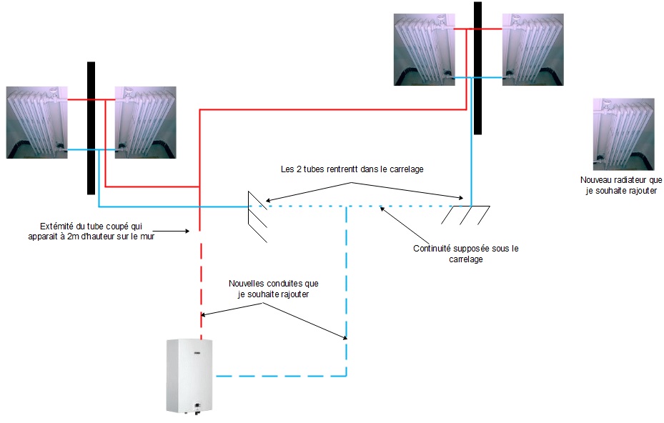 J'ai essayé de suivre et de dessiner le réseau (voir le schéma), j'ai trouvé que le tube du chaud est coupé en sortant d'un mur en haut, je suppose que ce tube continuait (en apparent) autrefois jusqu'à la chaudière. Et 2 tubes retour qui s'enfoncent dans le carrelage, je suppose qu'ils se rejoignent sous le carrelage et qu'autrefois le tube de jonction sortait au niveau de la chaudière.