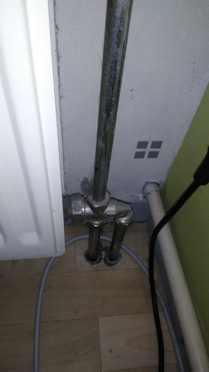Je pense que la canalisation du coté droit est un tuyau en PVC, le radiateur peut probablement être posé au dessus de ce tuyau.