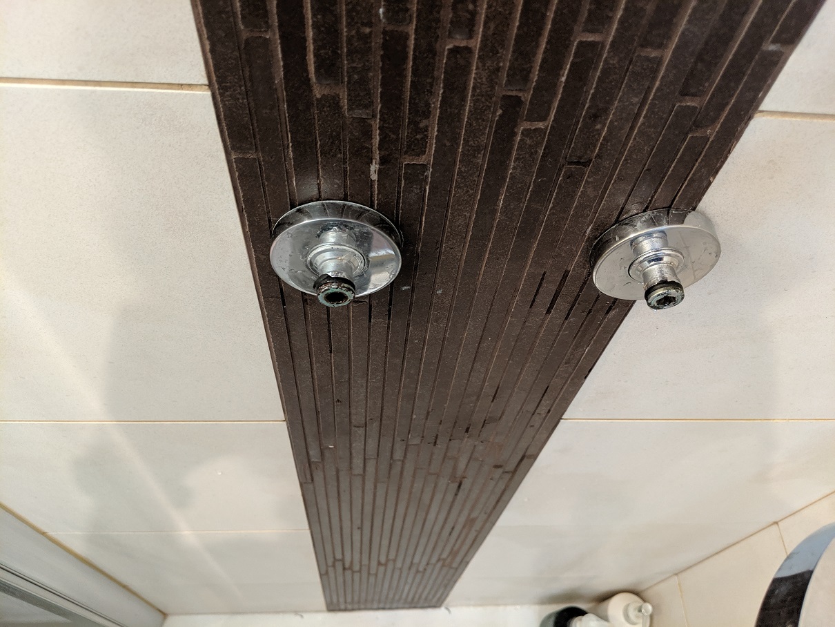 Je suis en train de démonter une colonne de douche pour la changer ; le démontage est pratiquement terminé, mais là où je m'attendais à devoir simplement dévisser les rosaces et accéder aux raccords excentrés, j'ai les raccords que l'on voit sur la photo (impossible de sortir les rosaces pour en voir plus).