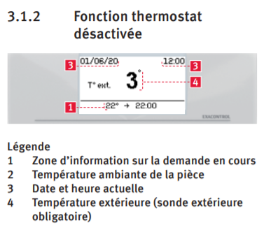Autre chose, en mode de fonctionnement avec la fonction thermostat désactivé, sur l'exacontrol, je vois la température extérieure et aussi, en dessous, la consigne. Je suis étonné de voir la consigne vu que la fonctionne thermostat a été désactivée. Edit : je joins une photo pour que ca parle a tout le monde :). Et ma question est sur la legende numero 1 appelee : Zone d'information sur la demande en cours.