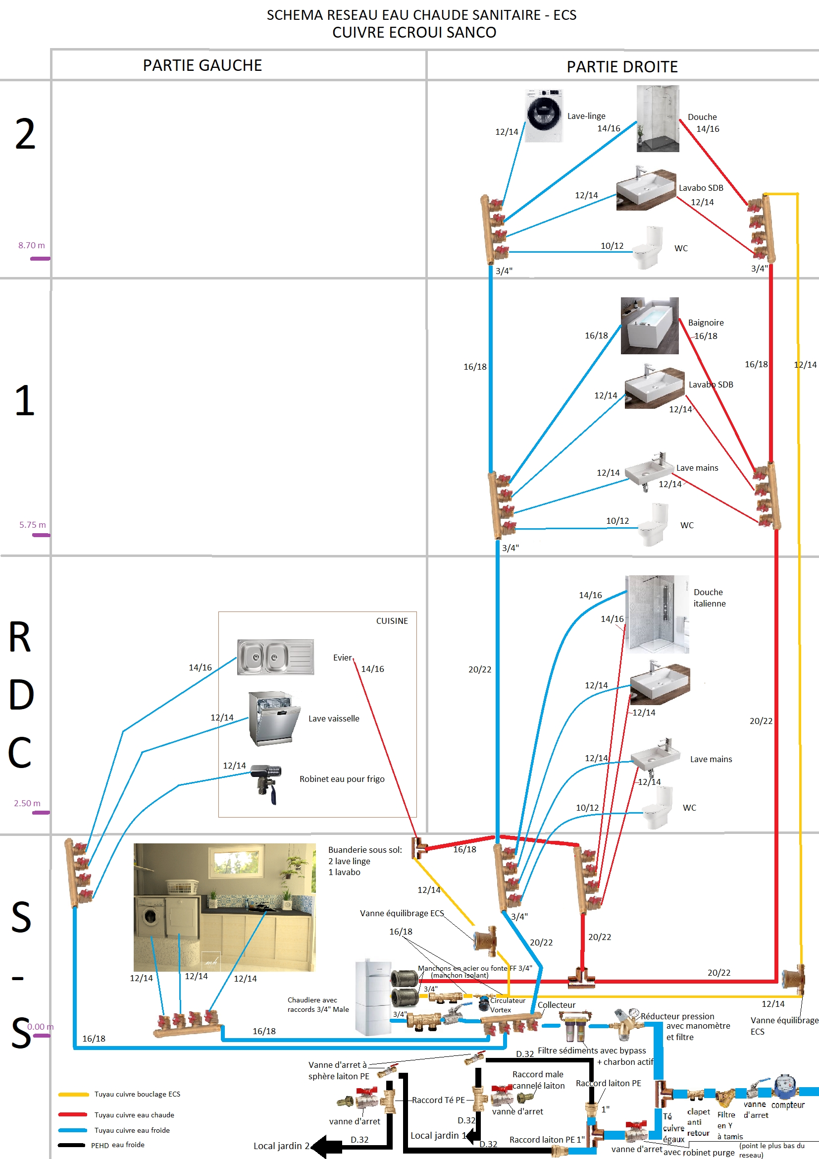Sur les bouclages ECS, il est conseillé d'utiliser des tuyaux plus petits: est ce que sur mon schéma, j'ai dimensionné correctement les tuyaux ?