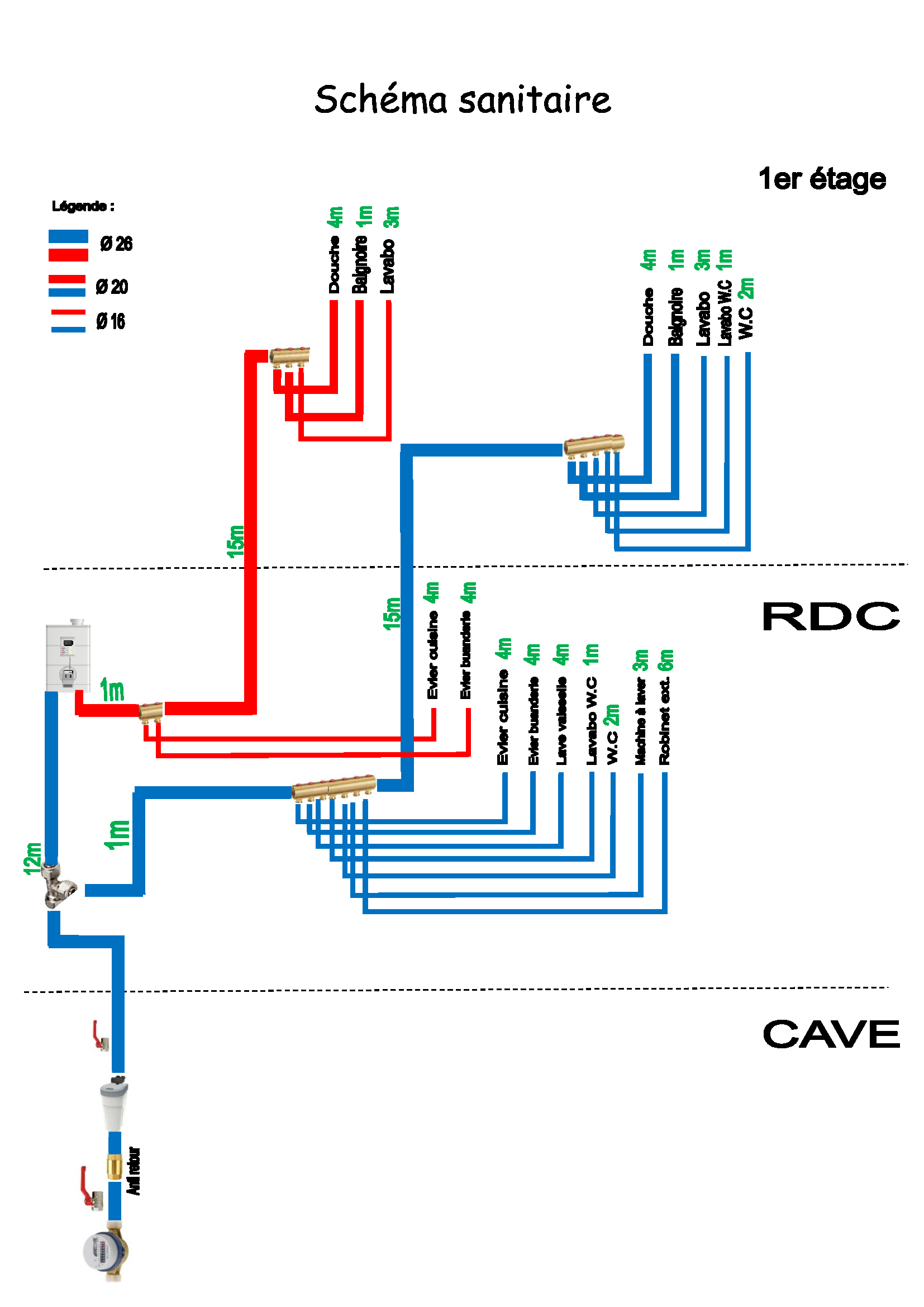 Nous devons refaire toute l'installation sanitaire et chauffage de notre maison. Nous avons dessiné un premier schéma, nous aimerions avoir votre avis, voir s'il manque quelque chose ou si il faut modifier quelque chose.