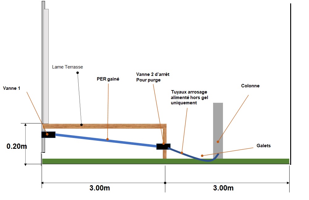 Une autre option sera de faire demarrer un tuyau d'arriosage depuis la vanne 1 jusque la colonne qui sera vidé avant l'hier car facilement clipsable avec les système gardena?