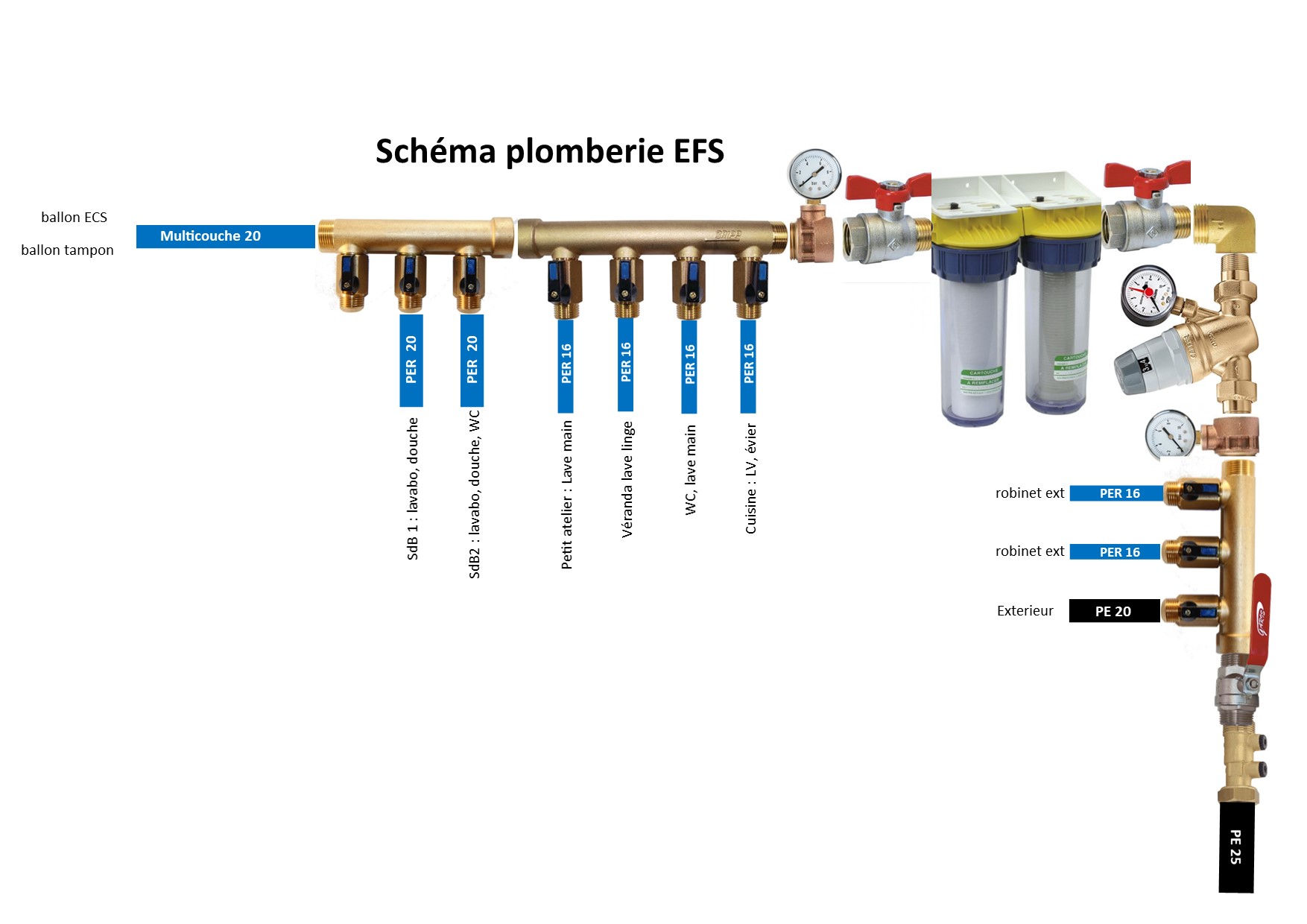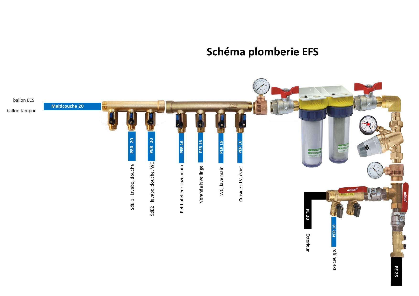 Pour ton réseau d'eau froide rien de bien compliqué, essaye toutefois de limiter le nombre de raccords et composants, par exemple: double mano ne sers a rien, triple mano encore moins.