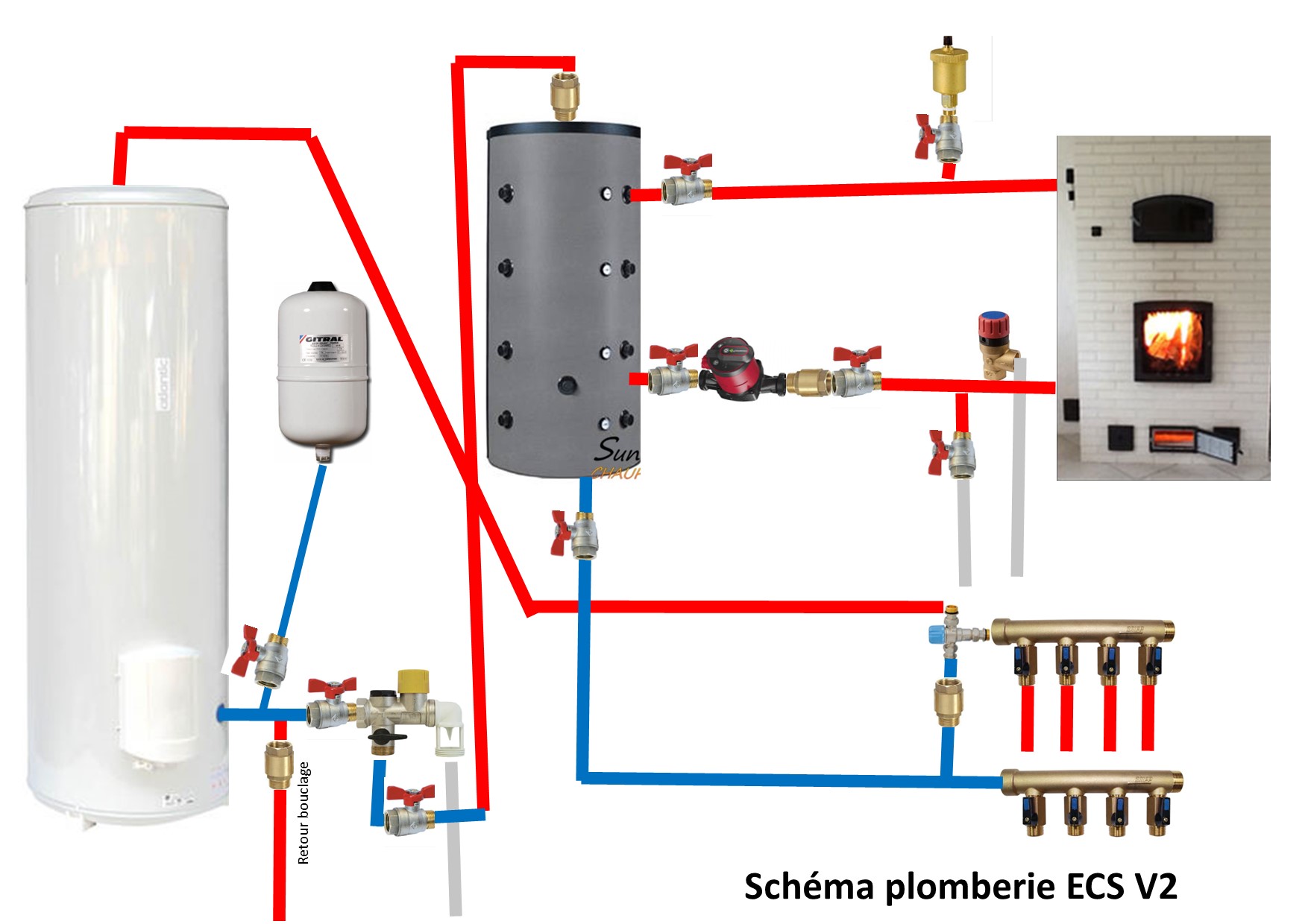 Pour l'eau chaude, je pense que c'est pas optimisé, tel que c'est tu dispose d'une trop grande quantité d'eau chaude que tu ne consommeras certainement pas et qui va se refroidir.