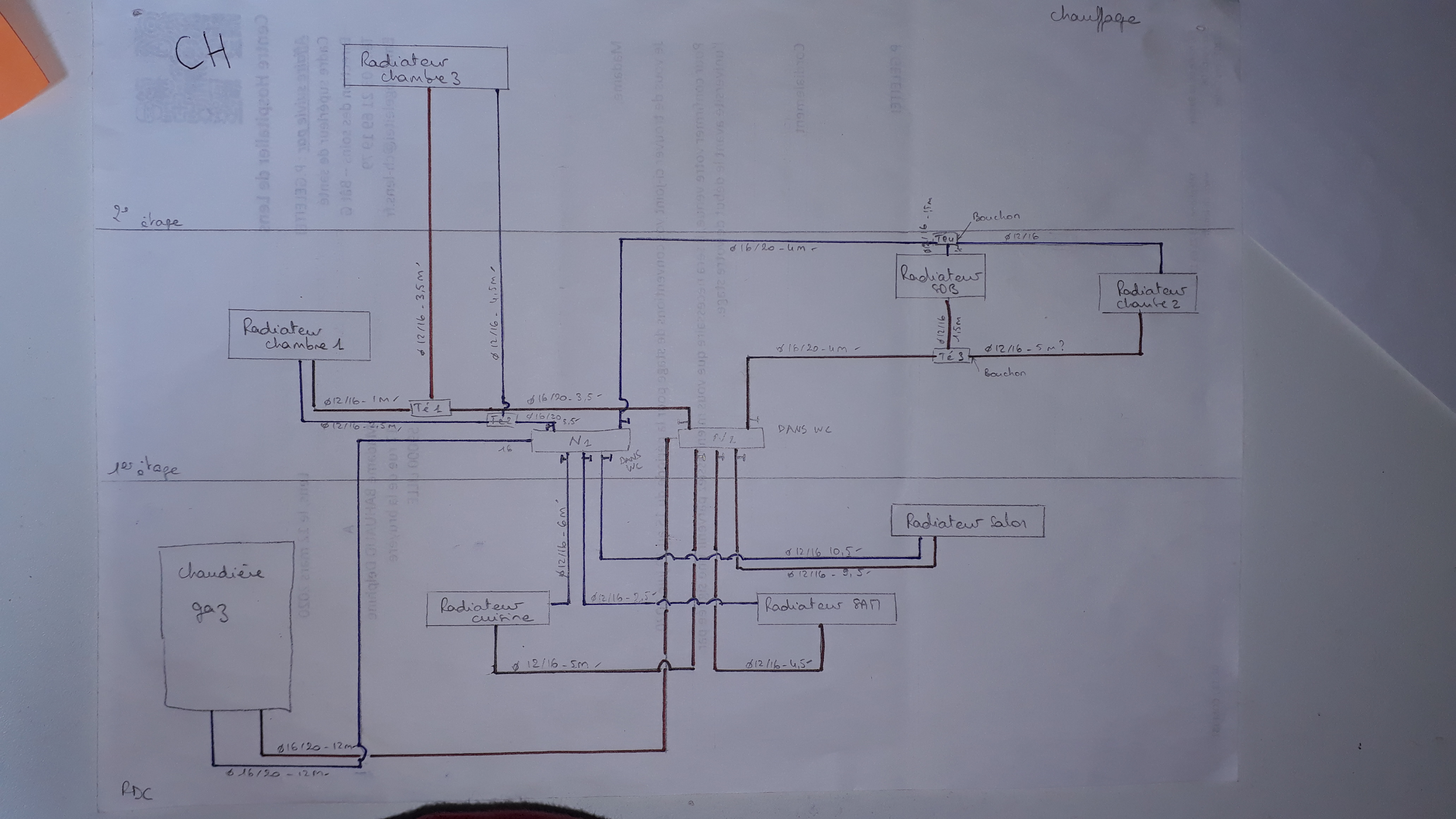 Entre temps nous avons un peu revu notre copie et avons finalement opté pour l'installation de nourrices à l'étage, je joins le schéma mis à jour du coup. Nous avons décidé de ne pas mettre de 20/26 mais du 16/20 dès la sortie chaudière.