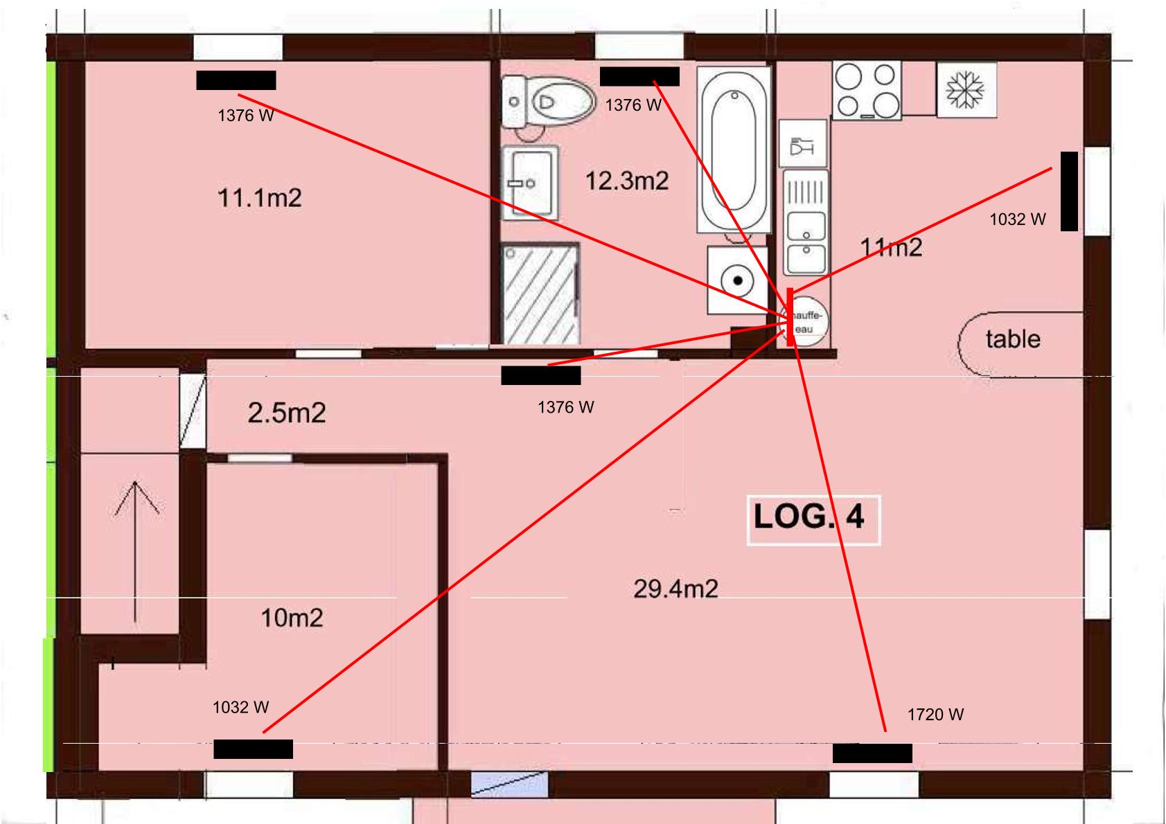 Je veux Installer le chauffage dans un logement, en multiplex, selon le plan ci-joint (je n’ai noté que le collecteur et le réseau eau chaude).