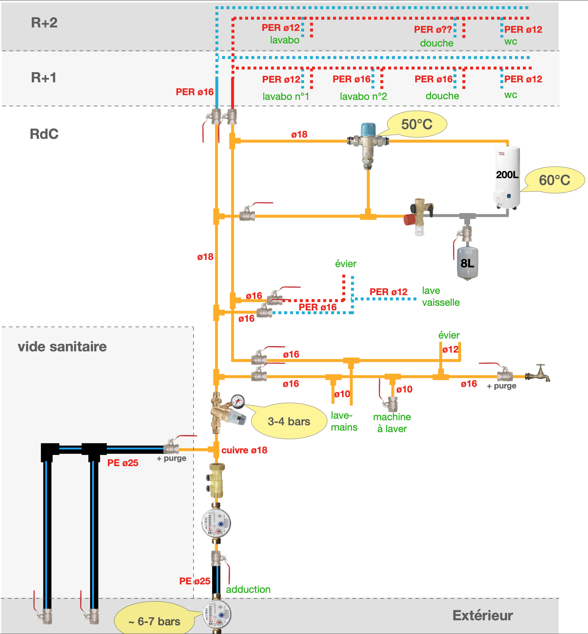 J'en arrive au schéma suivant, sachant que je ne modifie que la partie cuivre + PE. Tout le PER existant ne bouge pas.