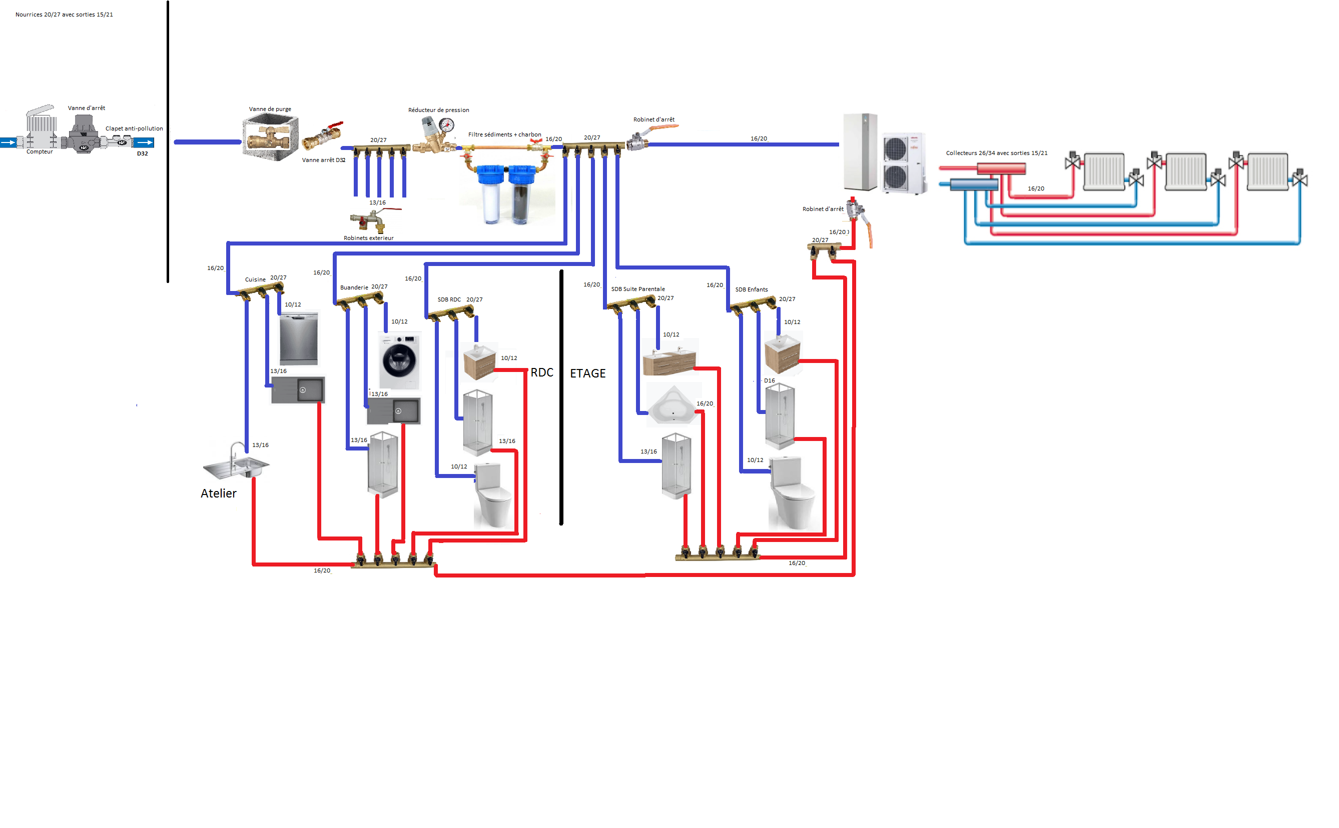 Faites une installation sans avoir recours a des nourrices secondaires et en surdimensionnant des diamètres d'une taille par rapport aux diamètre normaux.