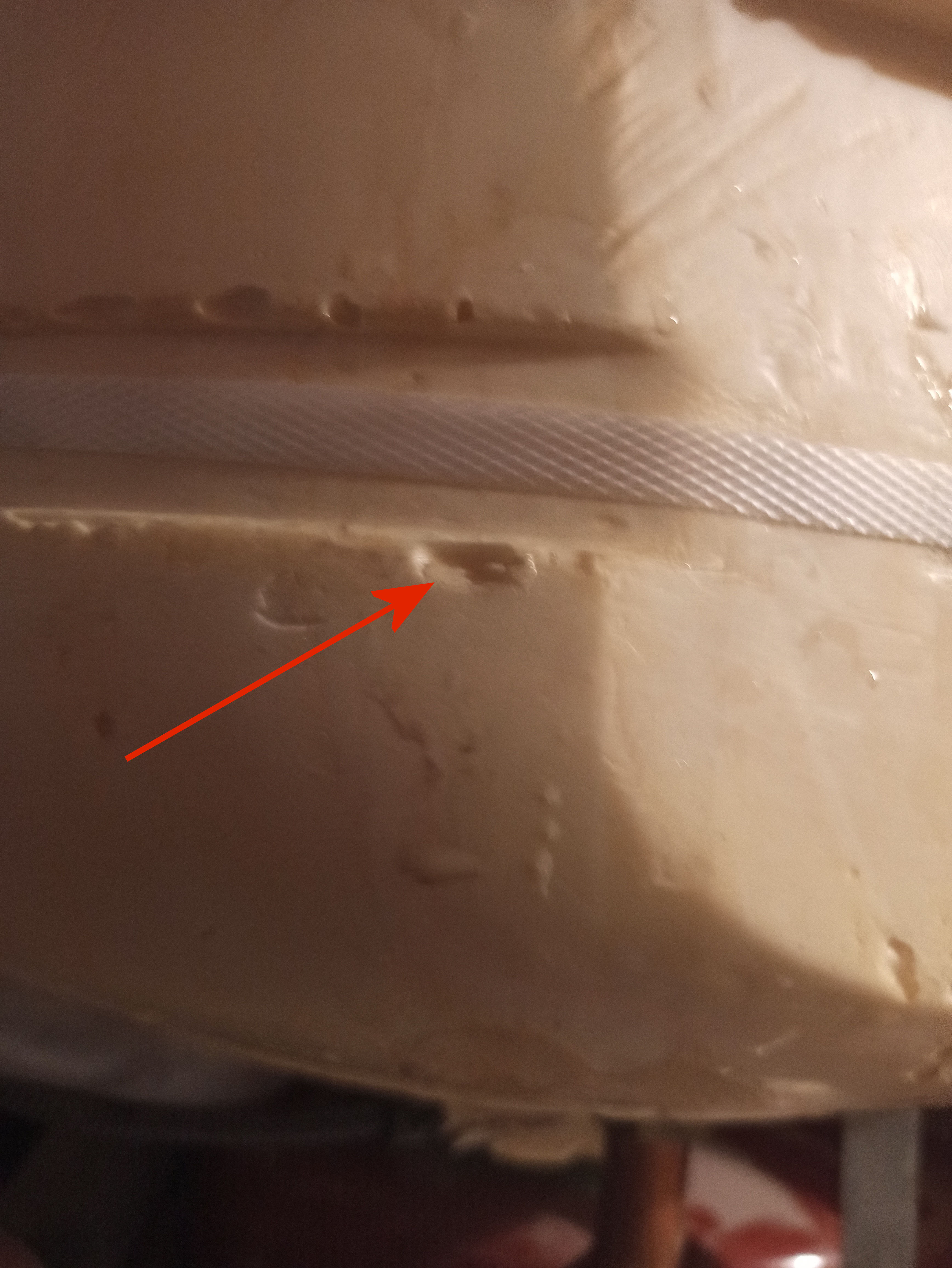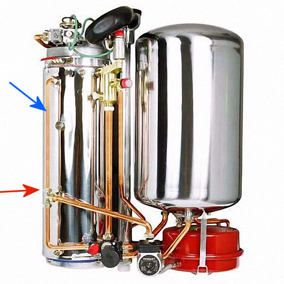 Tout à l'heure, alors que la pression était haute, je me suis rendu compte que de l'eau coulée de la chaudière. Je l'ai donc ouvert et voici les photos qui vous expliqueront certainement mieux la situation que mes mots. De l'eau sortait par moment du petit trou indiqué par la flèche. Il s'agit du ballon d'eau chaude :