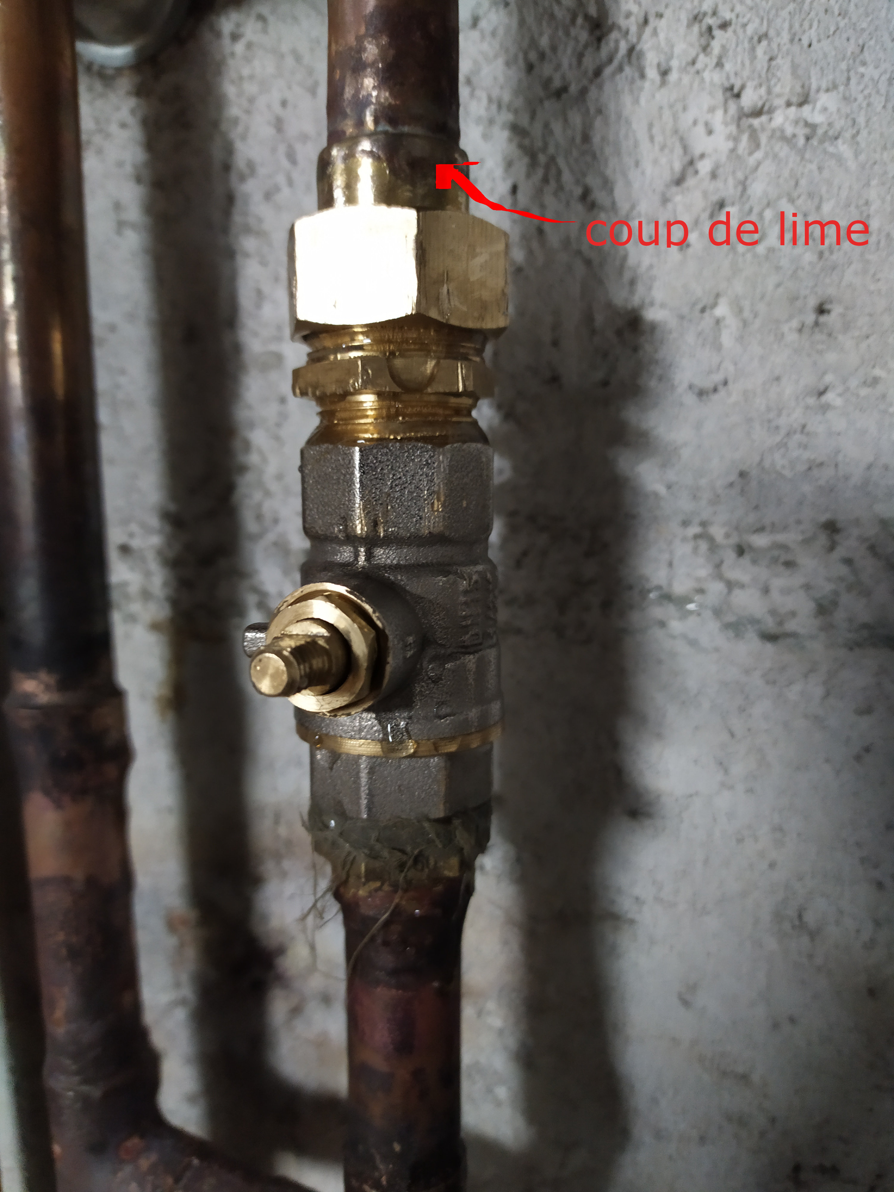 j'ai installé un raccord union 3 pièce 15/21 après une vanne FF à quart de tour. Le tuyau est en cuivre D16 et transporte l'eau chaude de la chaudière vers ma nouvelle salle de bain. Malgré un serrage énergique, il reste toujours une petite fuite au niveau du raccord sphéro-conique (voir image). Serrer encore plus ne semble donner aucune amélioration.