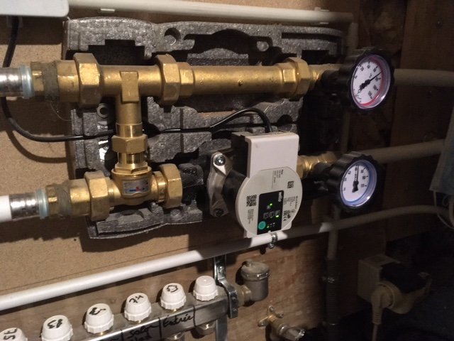 Alors, l'eau arrive du fourneau à 60 ° va au ballon tampon puis va au chauffage au sol qui mélange avec de l'eau du bas du ballon pour n'être qu'a par exemple 26°. Température demandée par le programmateur modulus clima.