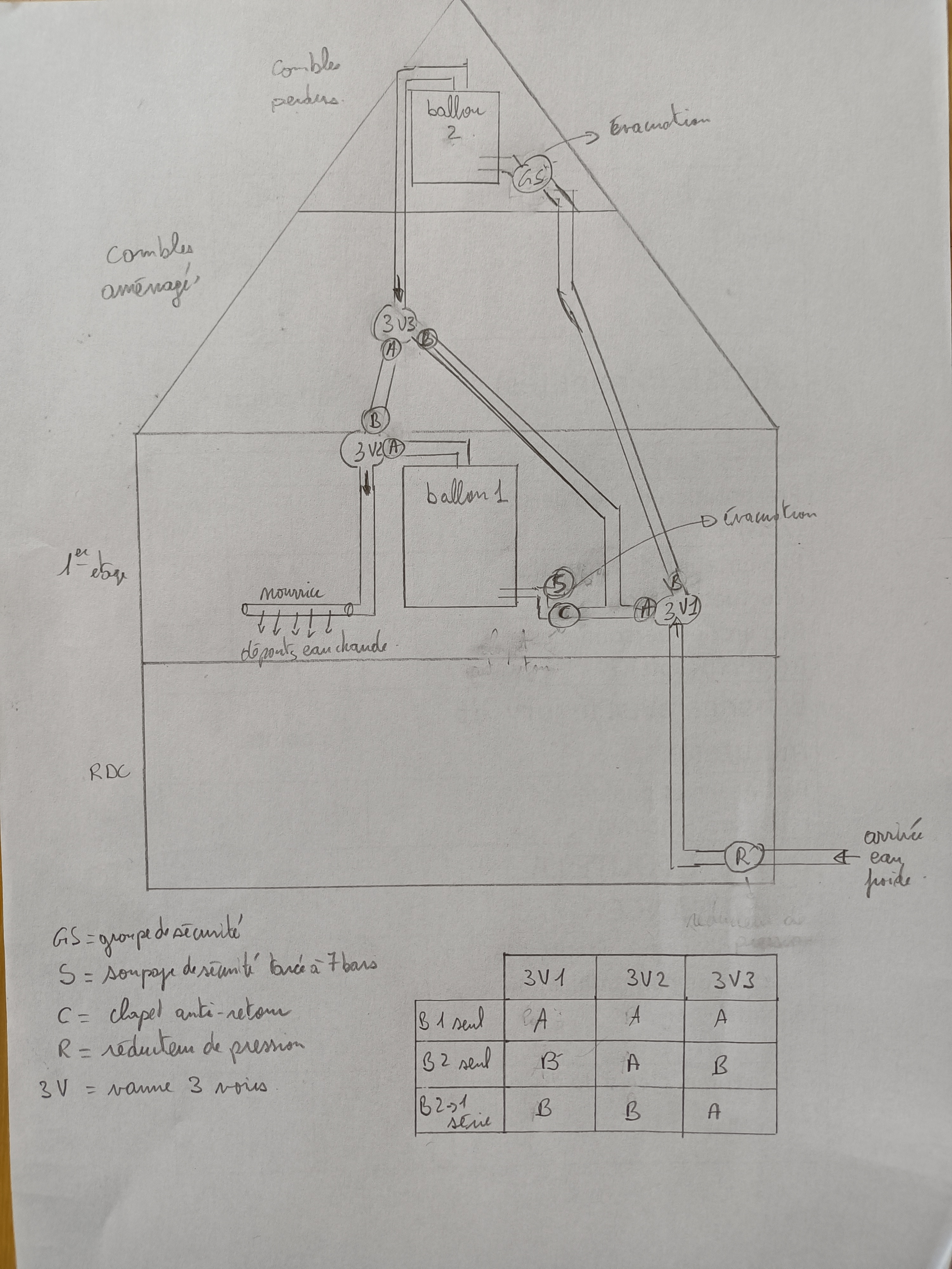 Je vous mets le schéma de montage que j'envisage (je souhaite pour évité les déperditions de chaleur dans les tuyaux que l'au chaude sorte du ballon principal) :