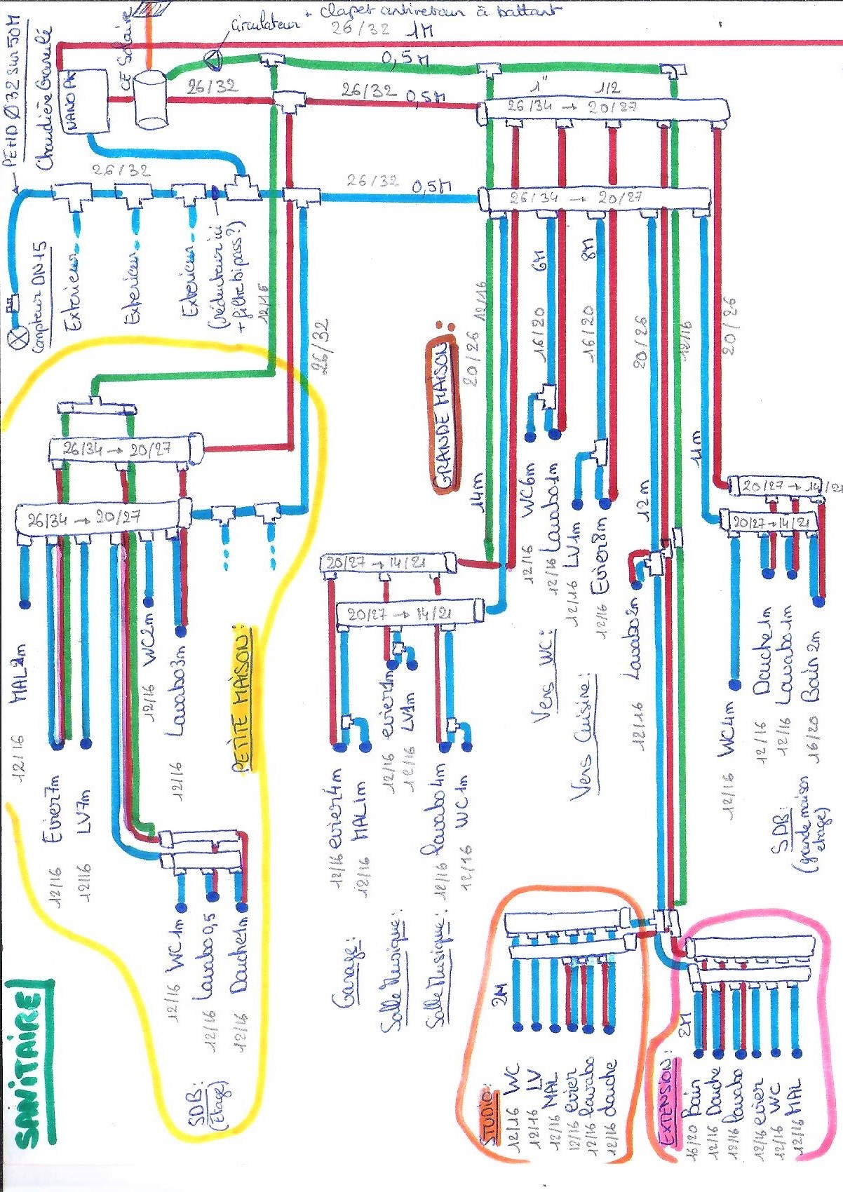 Je prévois l'installation en multicouche, pour les diamètres j'ai fais simple, la sortie chaudière est en 1" et l'arrivée EF en 32 donc je distribue les nourrices en 26/32 sur des collecteurs de 26/34, ensuite 20/26 pour alimenter les nourrices en 20/27, et après presque tout en 12/16.
