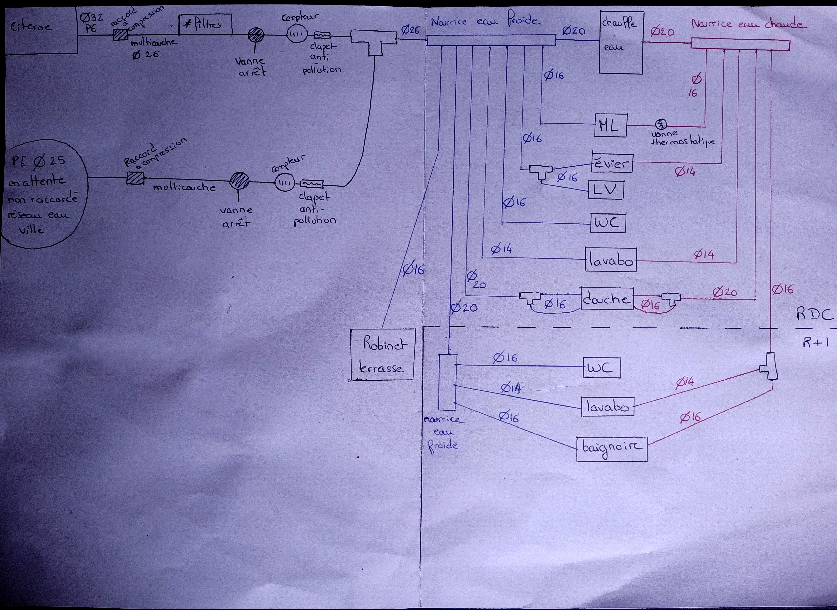 Mon mari et moi réalisons notre maison en auto-construction et comme c'est moi qui me charge du plan de plomberie j'aimerais avoir vos avis et critiques sur notre réseau d'eau en multicouche.