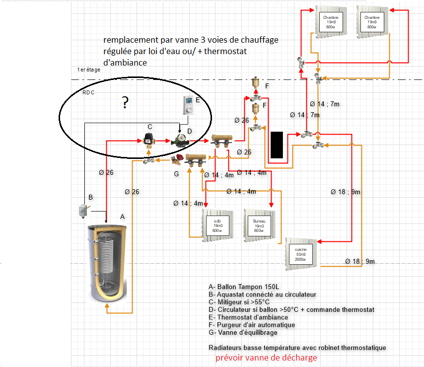 3) Sur l'image "Composant" est-ce que les dispositifs (vase d'expansion, vanne anti-condensation, vanne de sécurité pour chaudière, circulateur retour, sonde) ont une distance maximale vis-à-vis du point d'émission de chaleur ? J'aurais aimer cacher tout ça dans le local technique ?