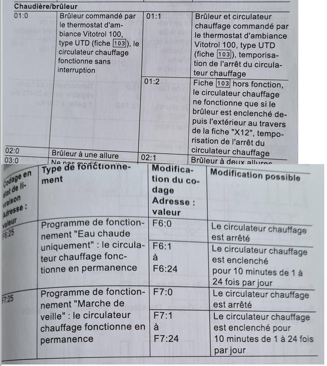 F6 + F7 : 2 = Dans les programmes eau chaude sanitaire uniquement et Installation hors gel le circulateur de chauffage tourne 10 mn toutes les 12 heures pour éviter qu'il se bloque. Ce reglage est paramétrable en nombre de démarrages par période de 24 heures, si on règle 24 il va tourner 10mn toutes les heures.