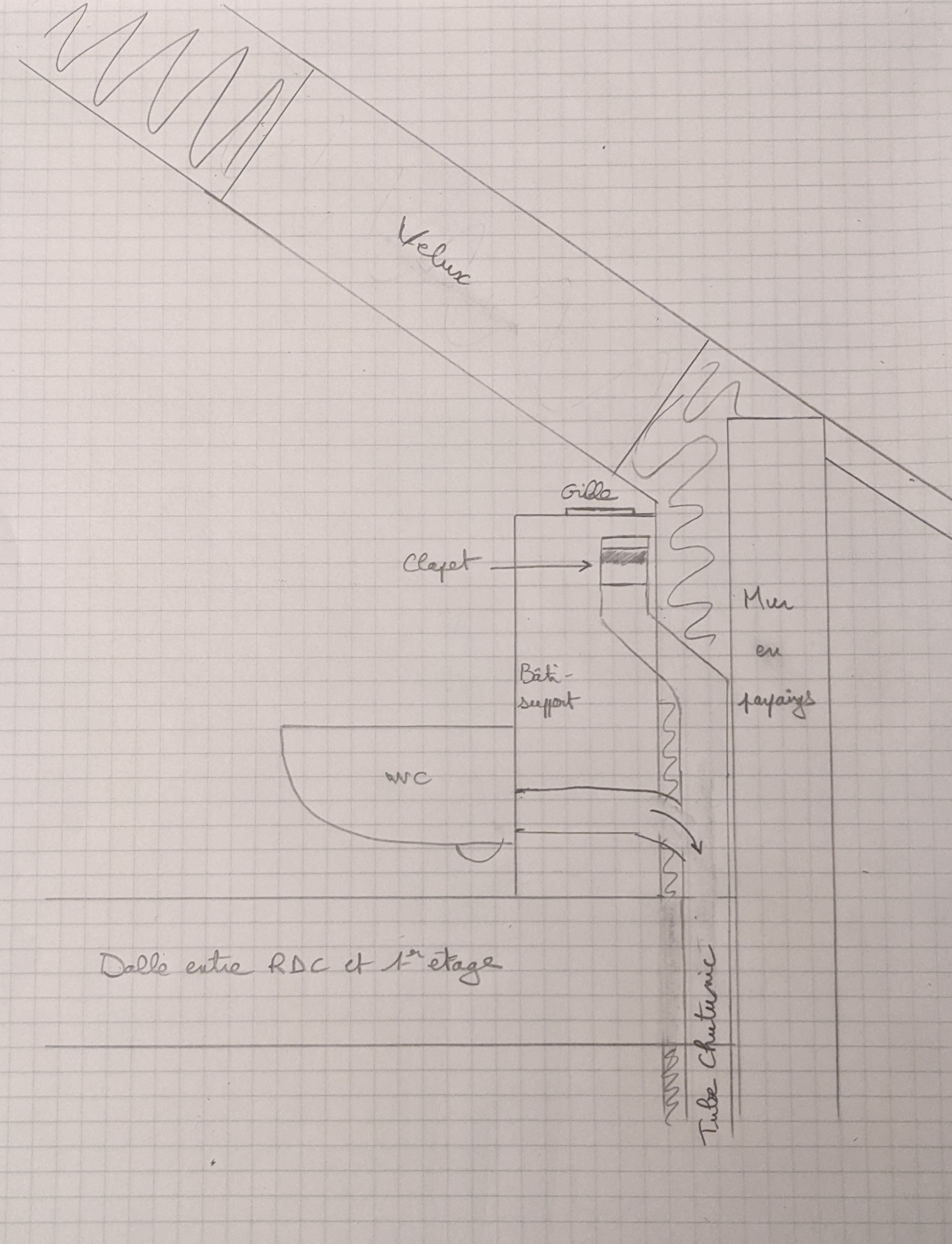 Précision : je compte installer des descentes verticales spiralées Chutunic, pour limiter le bruit des évacuations (celle des wc de l'étage descend derrière la contre cloison de la salle à manger !) et réduire le risque de siphonnage dans le réseau.