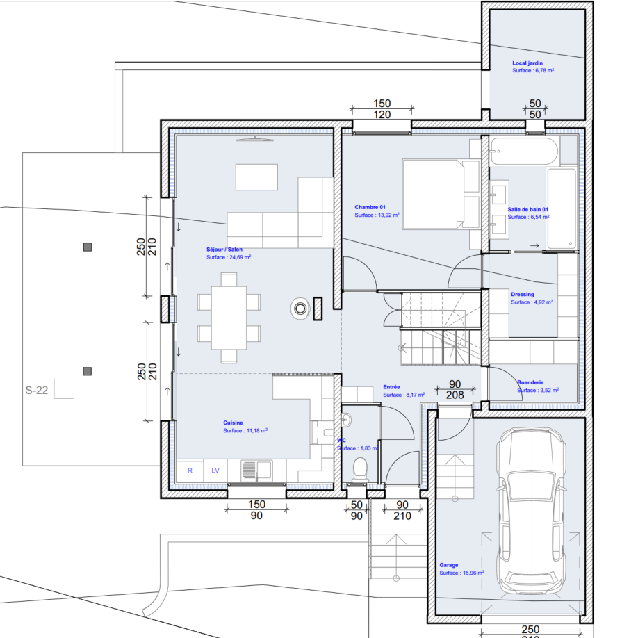 N.B : les éléments non encadrés sont localisés dans le garage. Je n'ai pas encore intégré la pompe à chaleur.