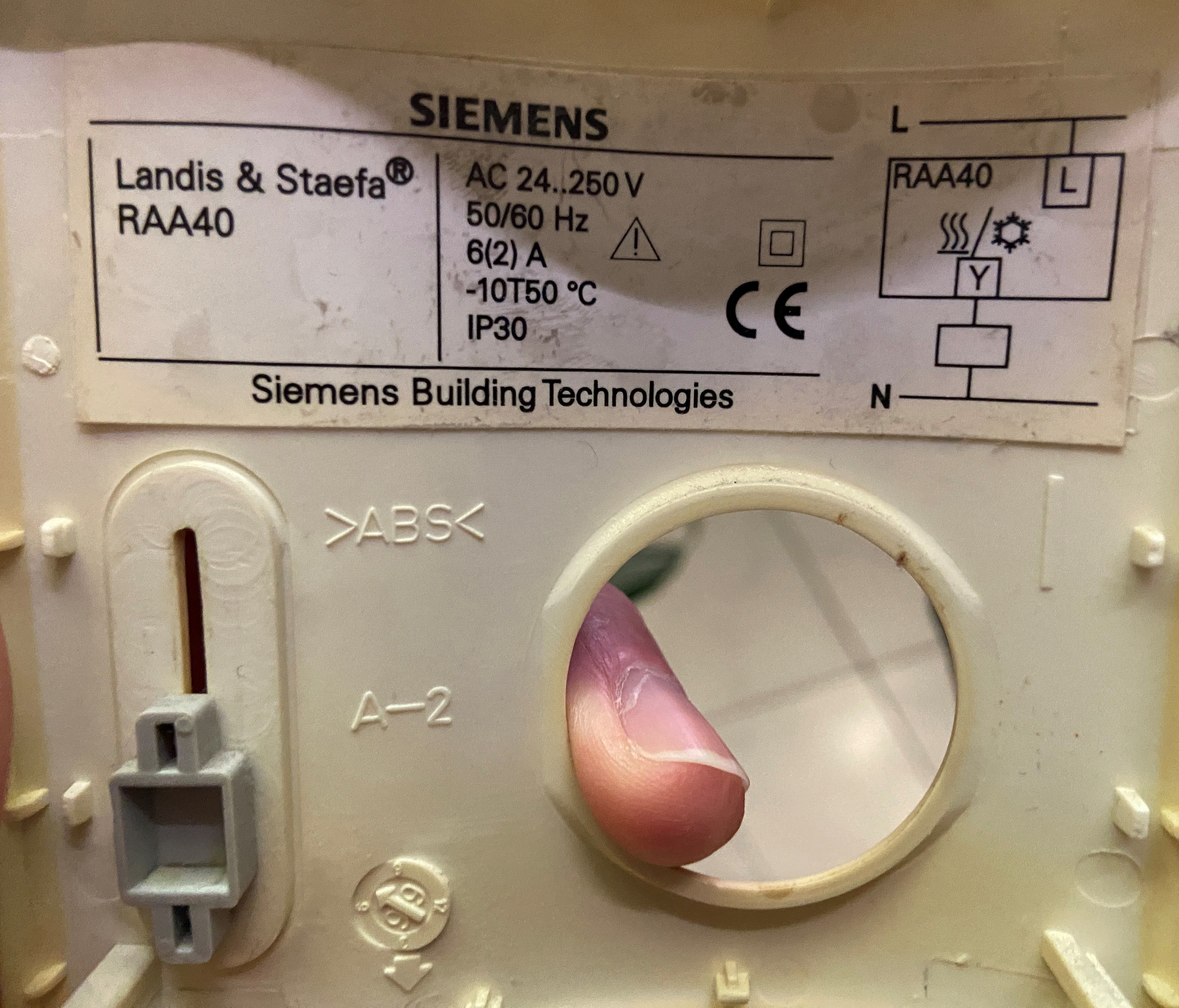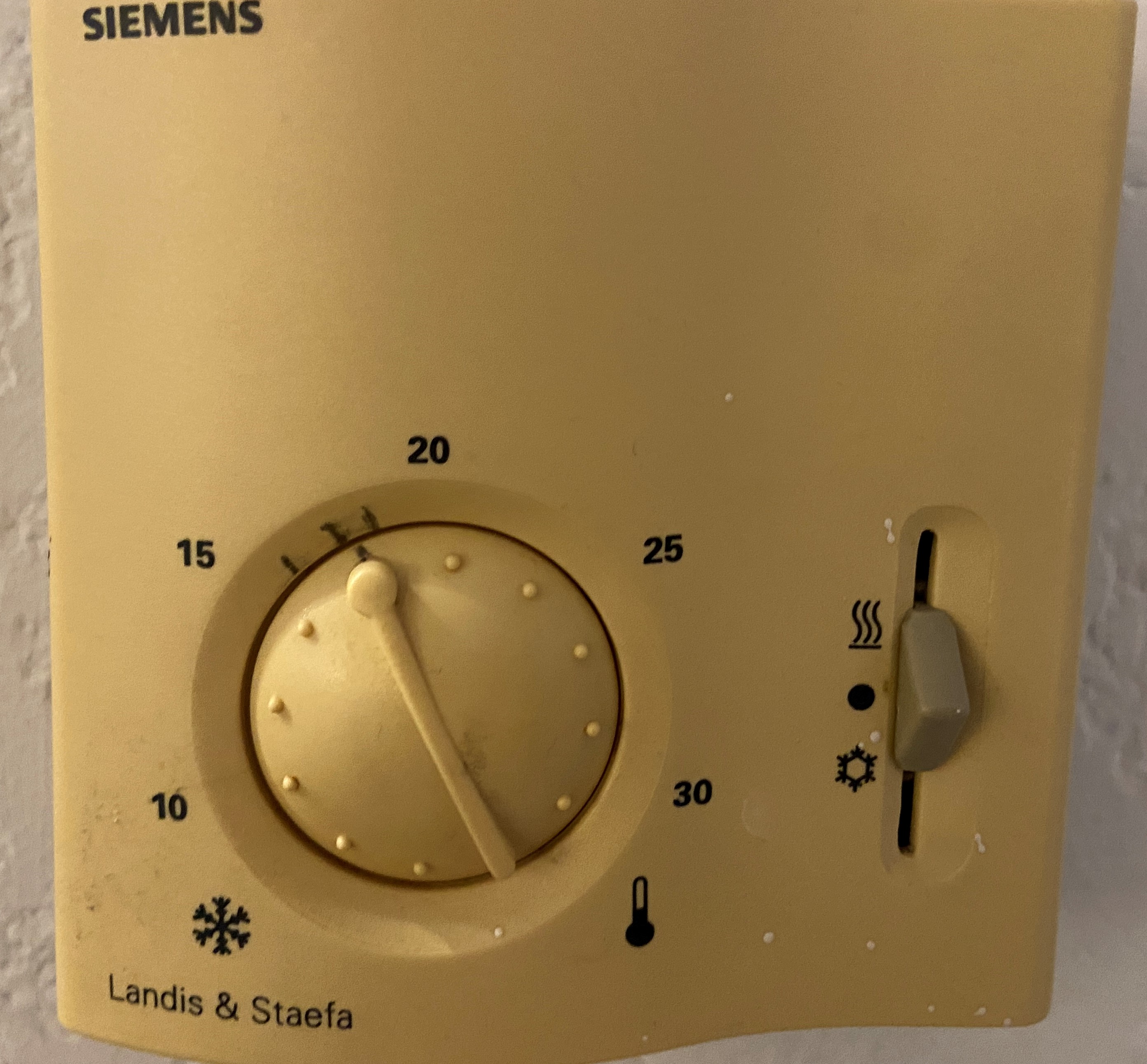 Il s'agit du RAA40 de chez siemens avec un commutateur chaud/froid. Le thermostat pilote une soufflerie commune à l'appartement qui envoie soit de l'air chaud, soit de l'air froid par pièce (un thermostat par pièce). Le thermostat à trois états. Chauffage jusqu’à la valeur de température, refroidissement jusqu’à la température réglé et mode arrêt.