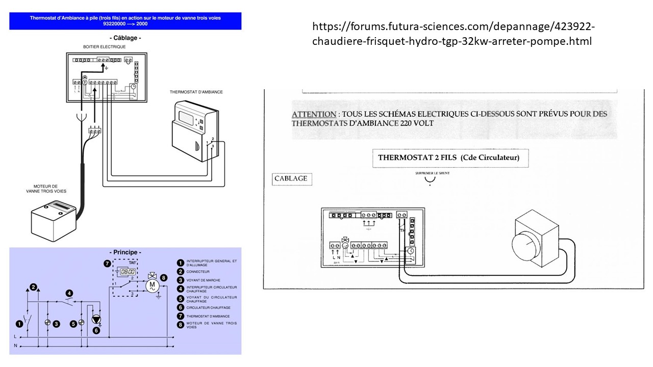 qui donne à priori des explications sur le fonctionnement et comprends 2 schémas que j'ai repris ci-dessous. Un schéma à gauche qui correspondait au branchement de mon ancien thermostat avec les 3 fils (indiqué thermostat d'ambiance à piles), et à droite au branchement que je viens de faire pour tester (indiqué branchement d'ambiance 220V).