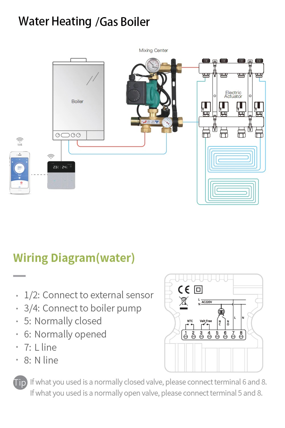 Pour votre MIJA, je suis perplexe car c'est un thermostat auto-alimenté et risque d'etre incompatible avec votre chaudière, car un des fils de la chaudière posséde deja son signal électrique qui doit boucler dans le thermostat, mais votre MIJA a aussi son signal d'entrée et gere seulement le signal sortant, aux borniers 5 et 6 pour piloter une vanne trois voies.