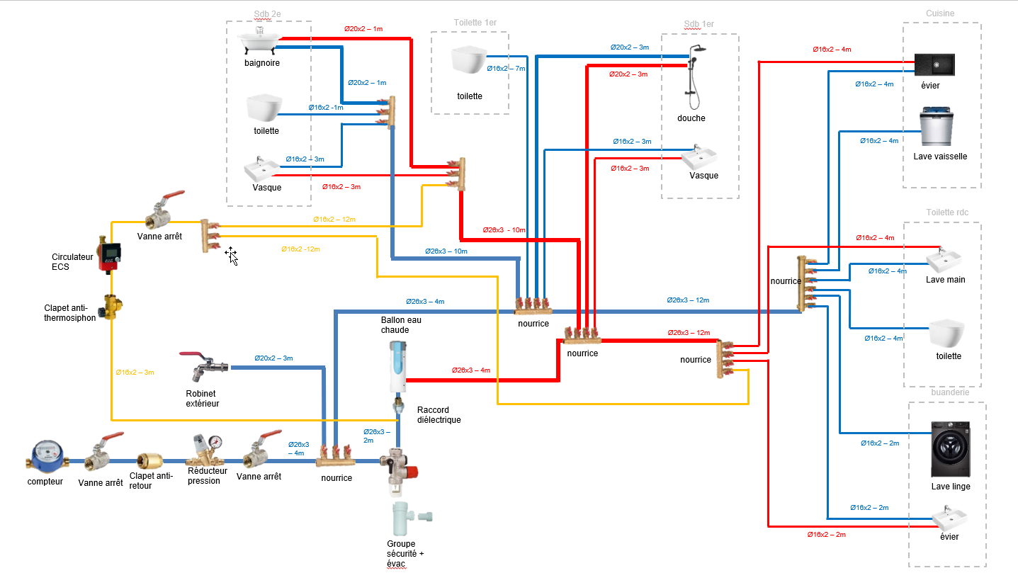 Je souhaite refaire complètement la plomberie de ma maison, j'ai réalisé un schéma de ma future installation.