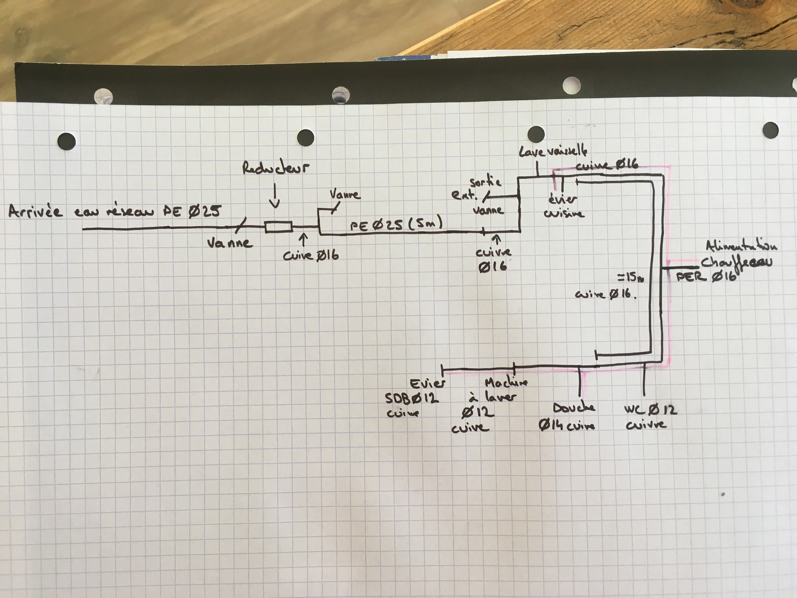 A l'heure actuelle, mon arrivée du compteur se fait dans le vide sanitaire en PEHD diamètre 25 jusqu'à mon réducteur de pression. De là j'ai un bout de cuivre en diamètre 18 avec un té, une des sortie finit sur une vanne 1/4 de tour non utilisé, et l'autre repart en PEHD diamètre 25 toujours dans le vide sanitaire jusque sous la cuisine. Là j'ai un raccord PE/cuivre et le circuit repart en diamètre 18 dans la dalle avant de ressortir en 16 dans ma cuisine.