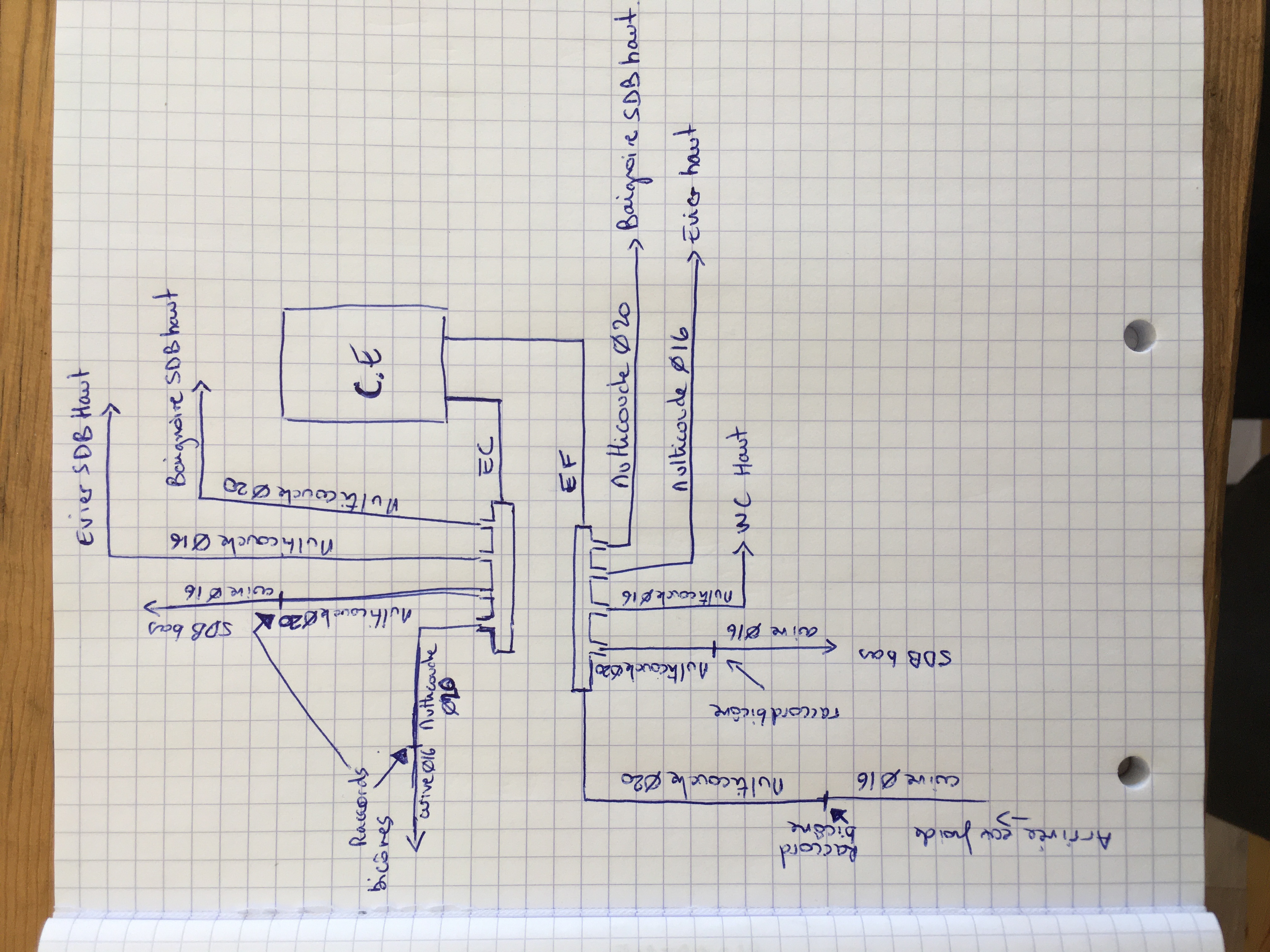 pour les sorties je pensais mettre du multicouche diamètre 20 (ext) pour la baignoire et du 16 pour le lavabo et WC, et du 20 pour repartir sur le cuivre en 16 de la salle de bain existante.
