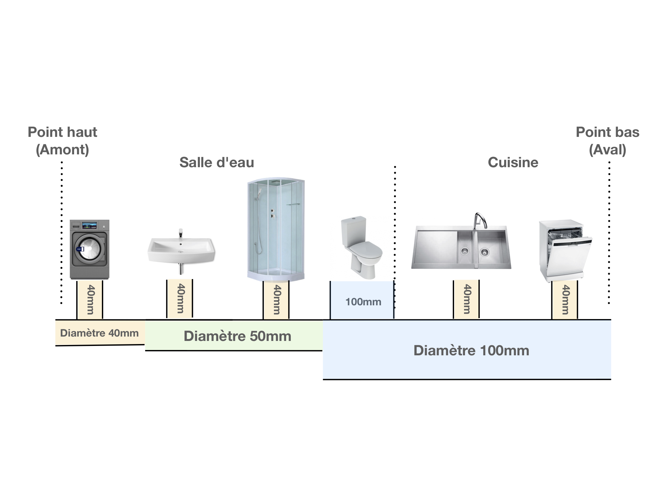 L'installation va être simple, c'est-à-dire une seule évacuation, dans l'ordre du point haut au point bas : Machine à laver -> lavabo -> douche -> WC -> évier -> Lave-vaisselle.