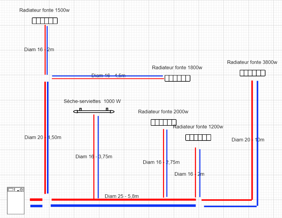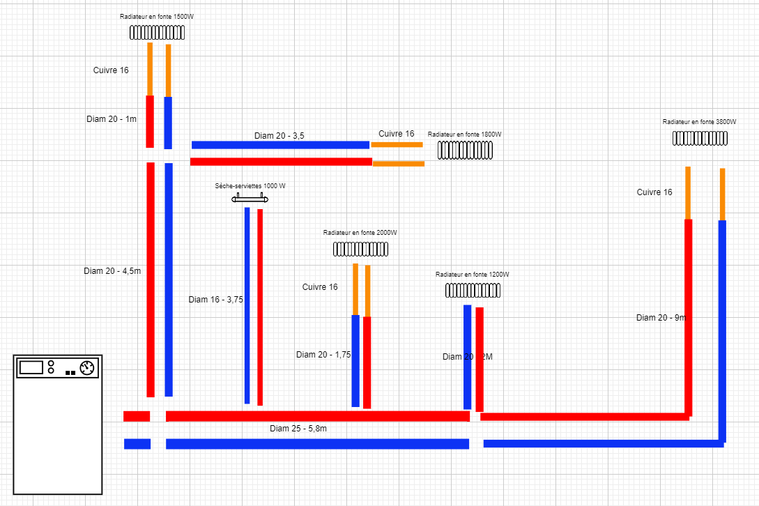 Après avoir montrer mon schéma, on me conseille d'alimenter tous les radiateurs (sauf le sèche serviette) avec du multitouche de 20 car se sont des radiateurs en fonte. Qu'en pensez vous ? Je n'ai pas trouvé de sujets similaires sur le forum.