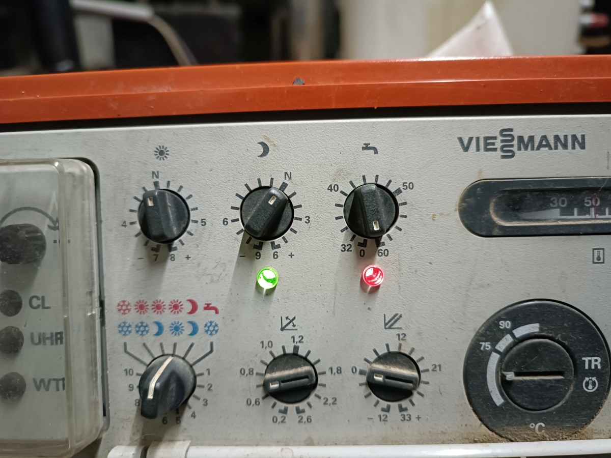 J'ai maintenant sur le panneau de contrôle deux voyants qui clignotent lentement et en même temps, un rouge et un vert en dessous du bouton pour régler la température du chauffage la nuit (lune) et celui de la température de l'eau chaude sanitaire respectivement (voir photo).