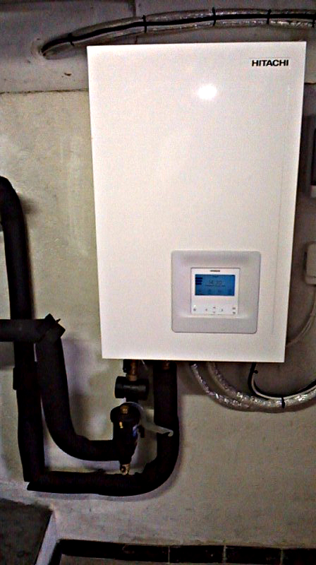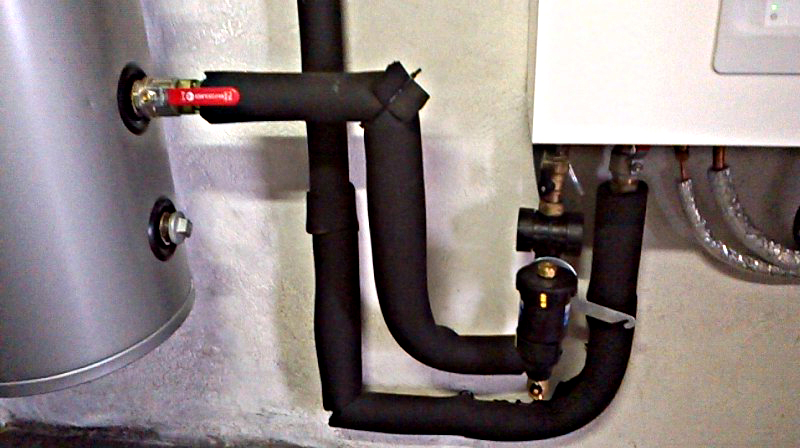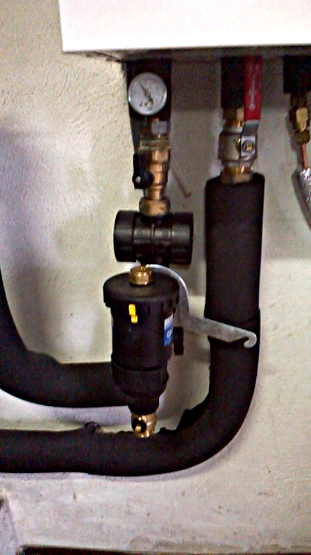 le dessin est inversé sur mon schéma mais la réalité sur place est correcte, on voit en rouge le vase d'expansion à gauche, l'échangeur en inox à droite et un bloc en laiton en dessous sur le tube retour après le pot à boue, j'ai l'impression que c'est le filtre fourni avec l'unité intérieure.