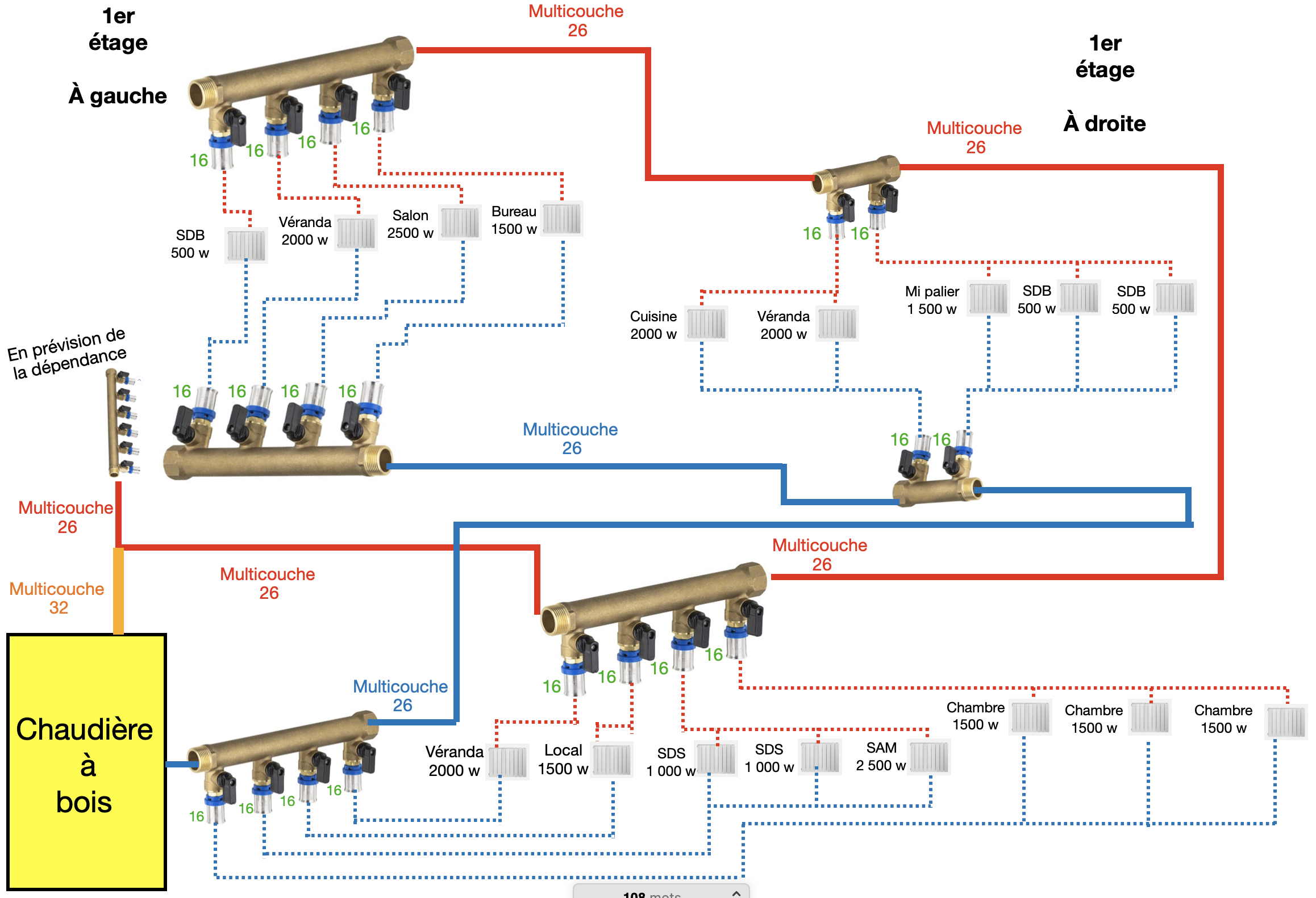 Je refais toute l'installation du chauffage central de la maison (nouvelle chaudière, nouveaux radiateurs, nouveau réseau en multicouche) et je me pose la question de la taille des tuyaux multicouche à acheter. Sur le schémas en pièce jointe, je prévois à 2 moments d'utiliser du multicouche 16 pour alimenter 3 radiateurs pour un total de 4 500w. Pensez vous que le 16 est suffisant ou bien il faut passer sur du 20 ?